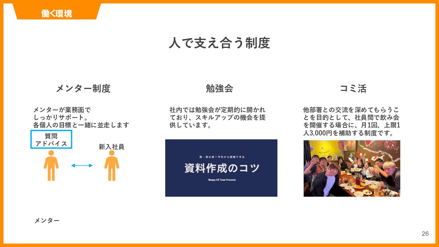 供しています。 他部署との交流を深めてもらうこ とを目的として、社員間で飲み会 を開催する場合に、月1回、上限1 人3,000円を補助する制度です。 新入社員 メンター 質問 アドバイス 26
