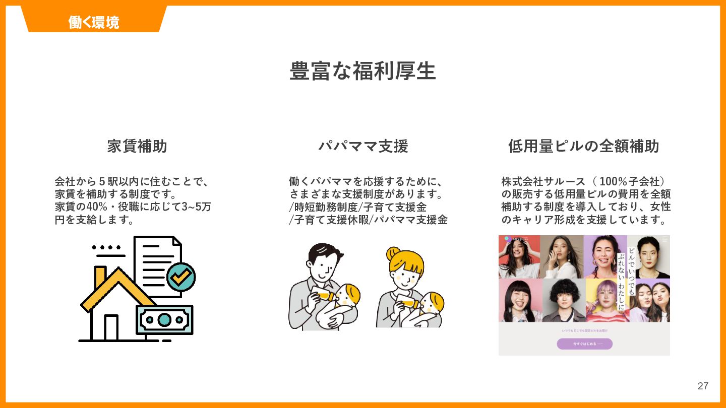 さまざまな支援制度があります。 /時短勤務制度/子育て支援金 /子育て支援休暇/パパママ支援金 株式会社サルース( 100%子会社) の販売する低用量ピルの費用を全額 補助する制度を導入しており、女性 のキャリア形成を支援しています。 27