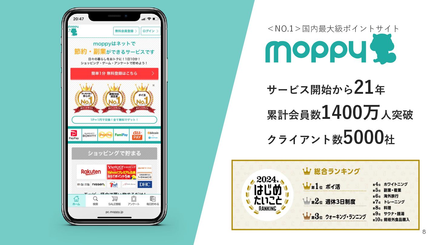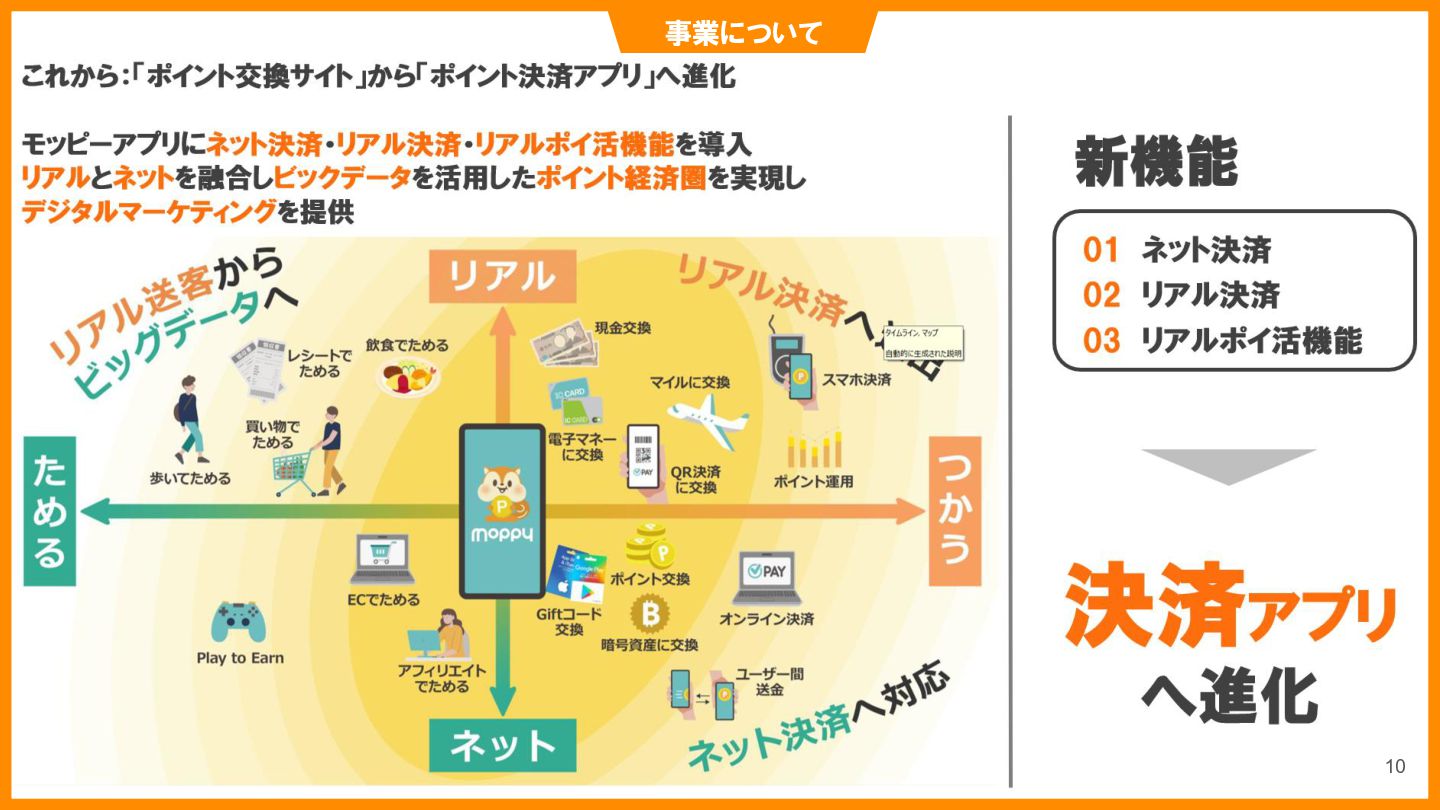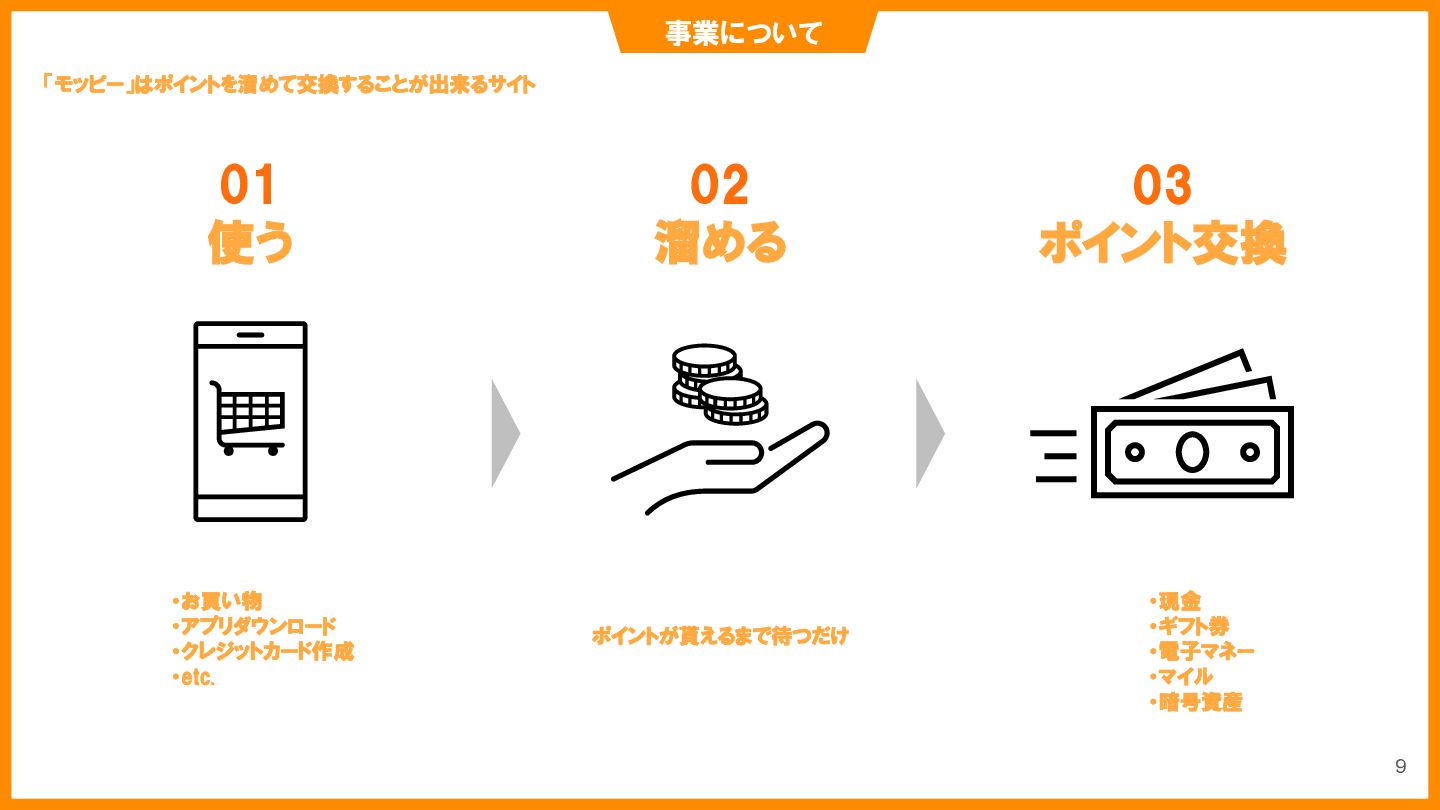 ポイントが貰えるまで待つだけ ・現金 ・ギフト券 ・電子マネー ・マイル ・暗号資産 「モッピー」はポイントを溜めて交換することが出来るサイト 事業について 9
