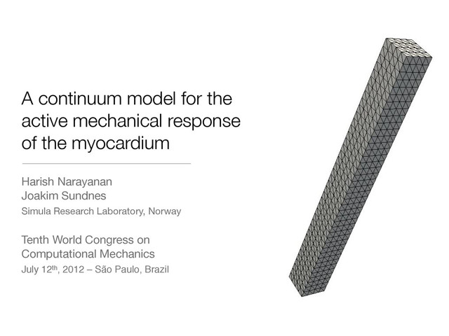 Ventricular myocardium serves as the functional tissue of the heart wall. Driven by intracellular calcium waves, the tissue rhythmically contracts to finite strains. Modelling this behaviour is a key step toward modelling the complex, coupled electro-chemo-mechanical behaviour of the heart.