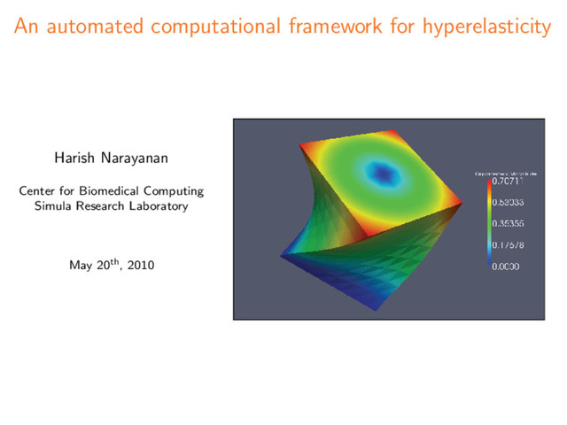 Nonlinear elasticity theory plays a fundamental role in modelling the mechanical response of many polymeric and biological materials. Such materials are capable of undergoing finite deformation, and their material response is often characterised by complex, nonlinear constitutive relationships. Because of these difficulties, predicting the response of such materials to arbitrary loads requires numerical computation (usually based on the finite element method). The steps involved in the construction of the required finite element algorithms are classical and straightforward in principle, but their application to non-trivial material models are typically tedious and error-prone. Our recent work on an automated computational framework for nonlinear elasticity, CBC.Twist, is an attempt to alleviate this problem. The framework is based on the FEniCS project, a collaborative project for the automation of computational mathematical modelling based on the finite element method.