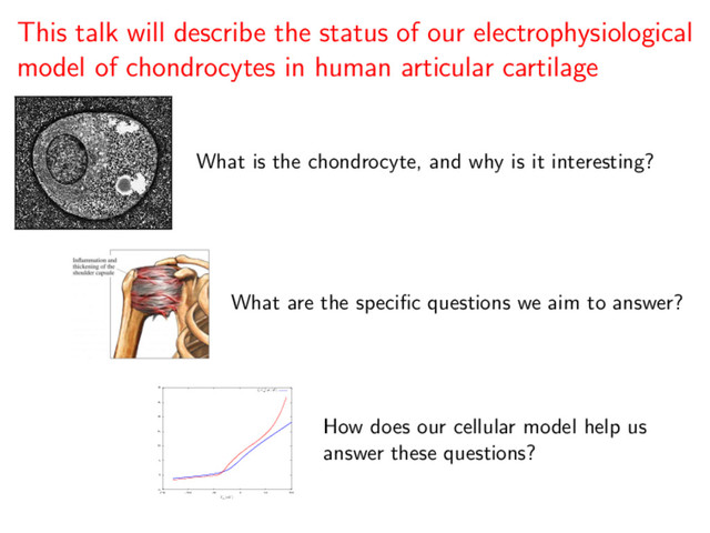This talk presents the first computational model of the main electrophysiological characteristics of the human chondrocyte. This model is illustrated by an in silico study of the TRPV4 current and is based mainly on an initial experimental data set which identified the main K+ currents expressed in single chondrocytes isolated from knee joints of healthy adult human donors. This model is validated by illustrating the role of a novel 2-pore K+ current in regulating the chondrocyte resting potential, and presents the possibility for integrating available data from electrophysiological, PCR and gene array experiments. It is also an important tool for rationalization of working hypotheses, design of new experiments, and understanding the principles and limitations of patch clamp methods as applied to the isolated human chondrocyte.