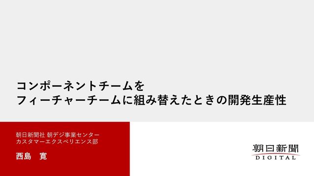 コンポーネントチームを フィーチャーチームに組み替えたときの開発⽣産性 朝⽇新聞社 朝デジ事業センター カスタマーエクスペリエンス部 ⻄島 寛