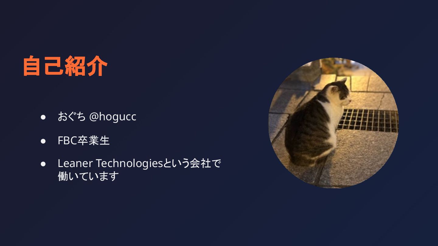 自己紹介 • FBC卒業生 • Leaner Technologiesという会社で 働いています • おぐち @hogucc