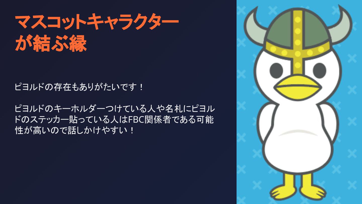 マスコットキャラクター が結ぶ縁 ピヨルドの存在もありがたいです! ピヨルドのキーホルダーつけている人や名札にピヨル ドのステッカー貼っている人はFBC関係者である可能 性が高いので話しかけやすい!