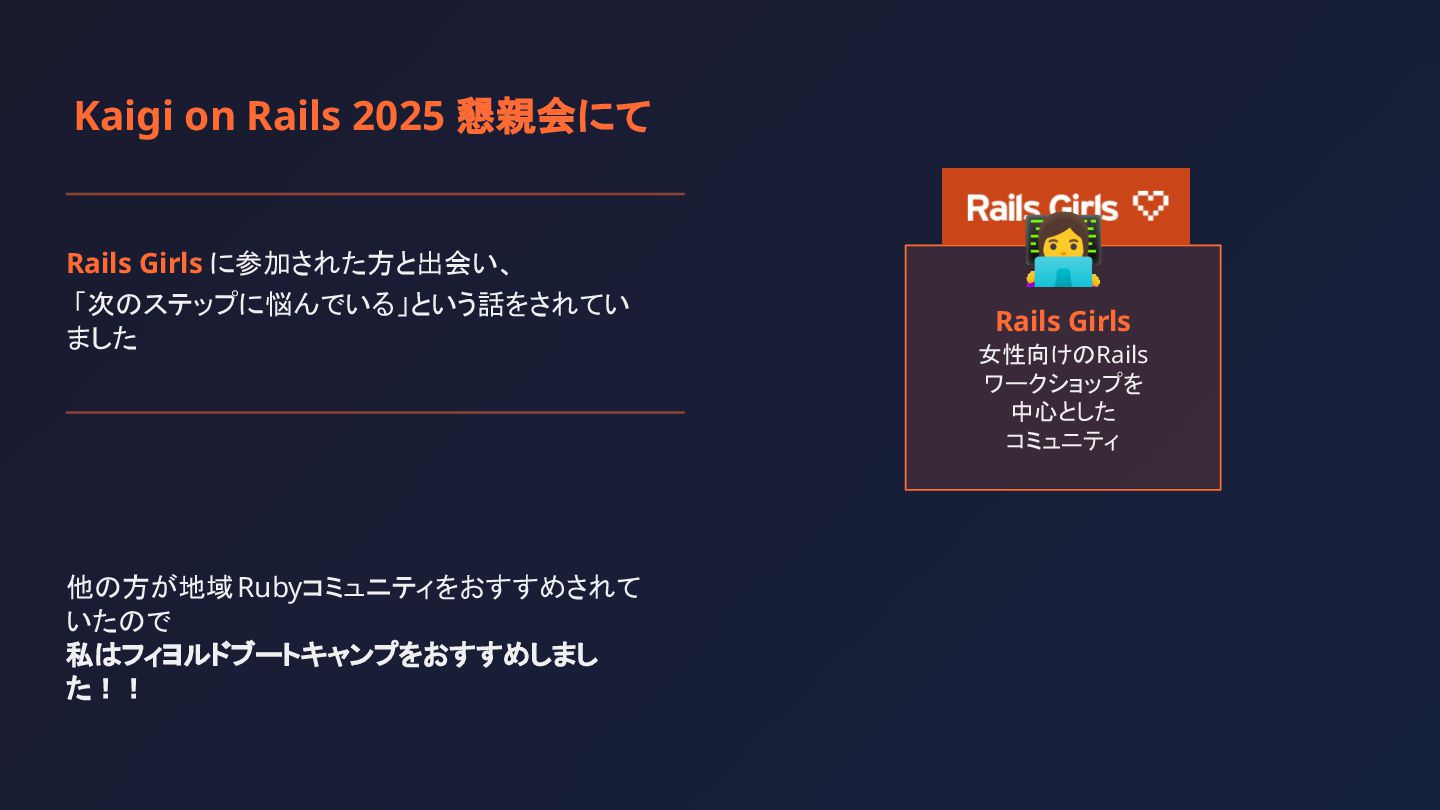 Kaigi on Rails 2025 懇親会にて Rails Girls に参加された方と出会い、 「次のステップに悩んでいる」という話をされてい ました