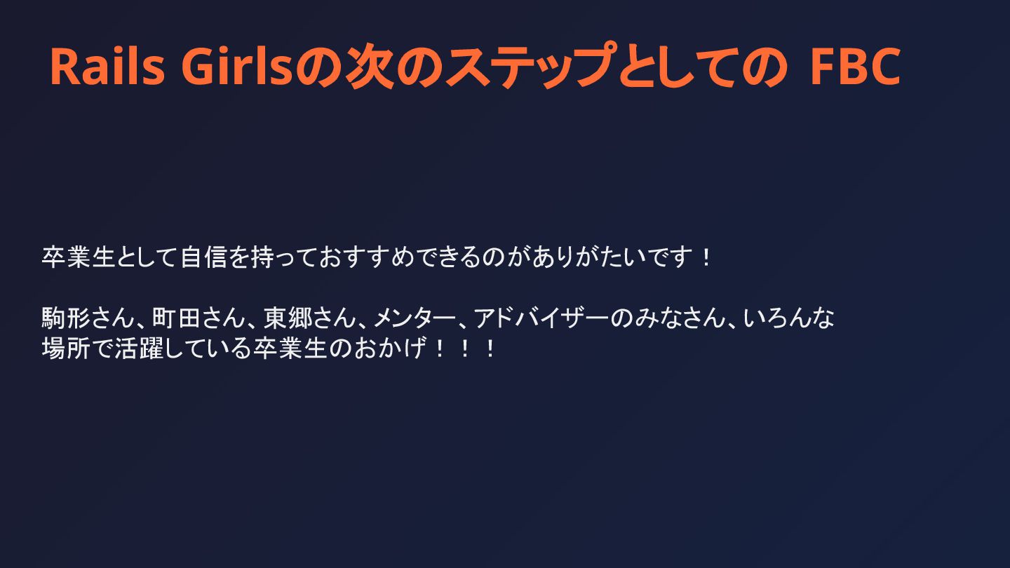 卒業生として自信を持っておすすめできるのがありがたいです! 駒形さん、町田さん、東郷さん、メンター、アドバイザーのみなさん、いろんな 場所で活躍している卒業生のおかげ!!! Rails Girlsの次のステップとしての FBC