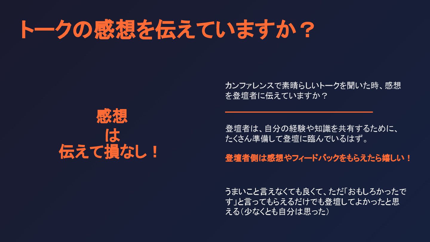 トークの感想を伝えていますか? 感想 は 伝えて損なし! カンファレンスで素晴らしいトークを聞いた時、感想 を登壇者に伝えていますか? 登壇者は、自分の経験や知識を共有するために、 たくさん準備して登壇に臨んでいるはず。 登壇者側は感想やフィードバックをもらえたら嬉しい! うまいこと言えなくても良くて、ただ「おもしろかったで