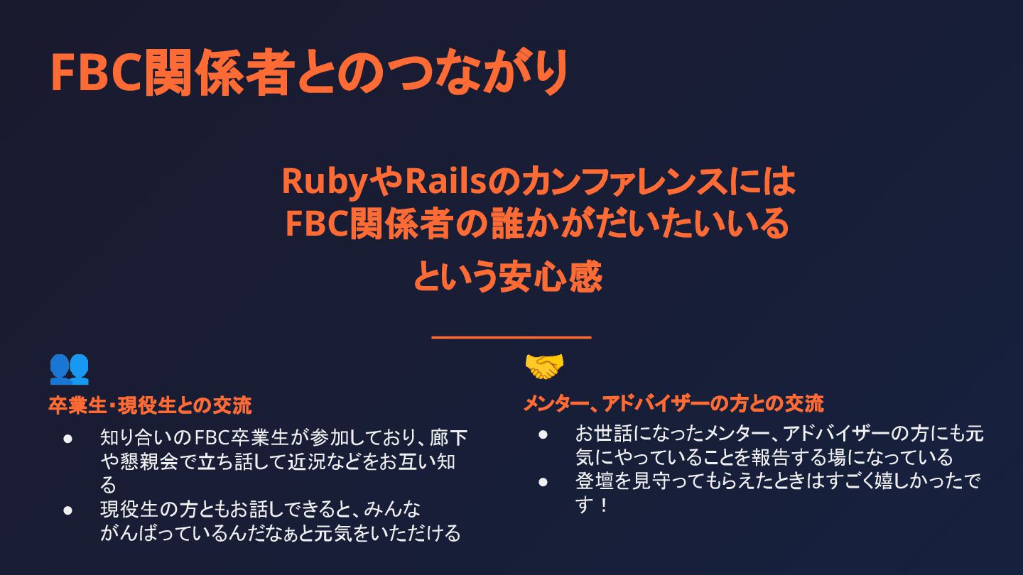 FBC関係者とのつながり RubyやRailsのカンファレンスには FBC関係者の誰かがだいたいいる という安心感 👥 卒業生・現役生との交流 • 知り合いのFBC卒業生が参加しており、廊下 や懇親会で立ち話して近況などをお互い知