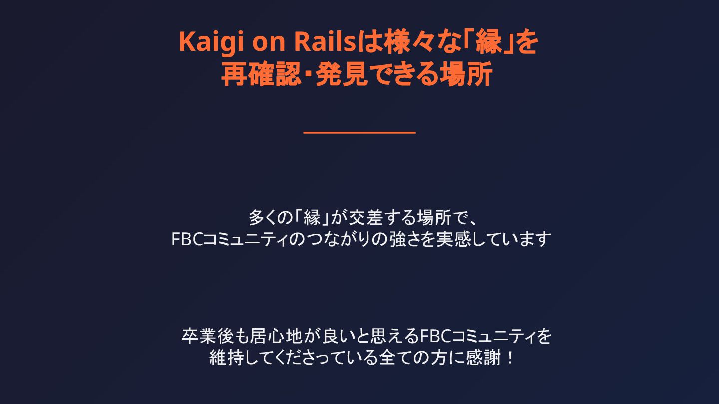 Kaigi on Railsは様々な「縁」を 再確認・発見できる場所 多くの「縁」が交差する場所で、 FBCコミュニティのつながりの強さを実感しています 卒業後も居心地が良いと思えるFBCコミュニティを 維持してくださっている全ての方に感謝!