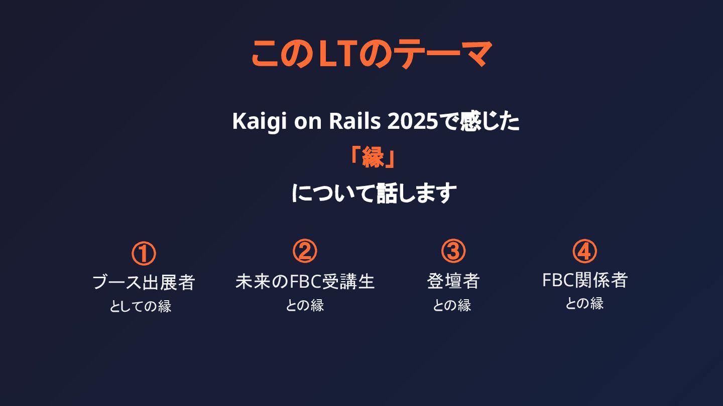 このLTのテーマ Kaigi on Rails 2025で感じた 「縁」 について話します ① ブース出展者 としての縁