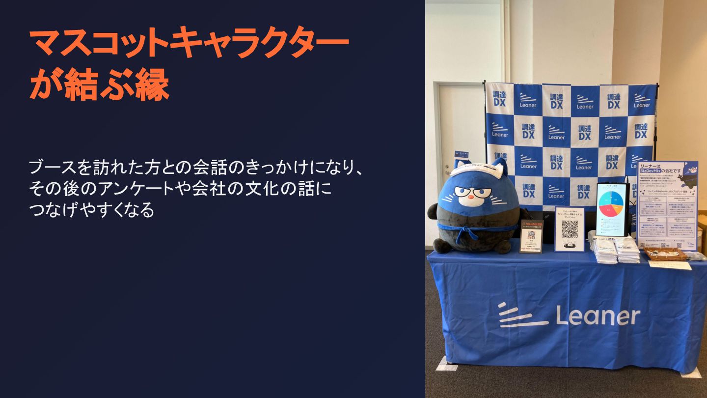 マスコットキャラクター が結ぶ縁 ブースを訪れた方との会話のきっかけになり、 その後のアンケートや会社の文化の話に つなげやすくなる