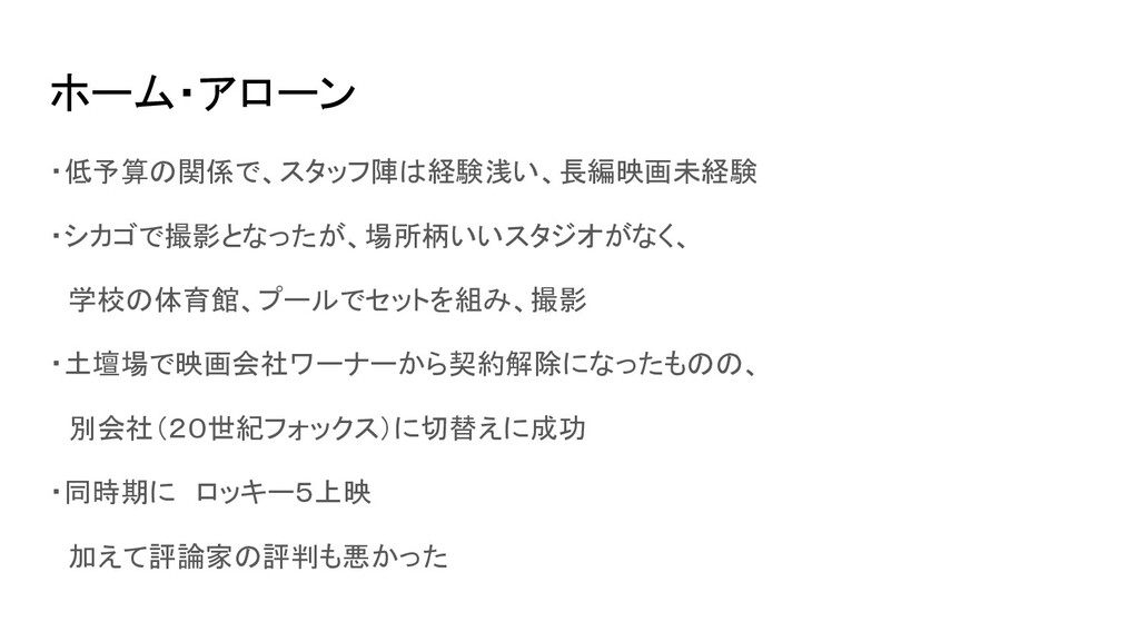 ホーム・アローン ・低予算の関係で、スタッフ陣は経験浅い、長編映画未経験 ・シカゴで撮影となったが、場所柄いいスタジオがなく、 学校の体育館、プールでセットを組み、撮影 ・土壇場で映画会社ワーナーから契約解除になったものの、 別会社(20世紀フォックス)に切替えに成功 ・同時期に ロッキー5上映 加えて評論家の評判も悪かった