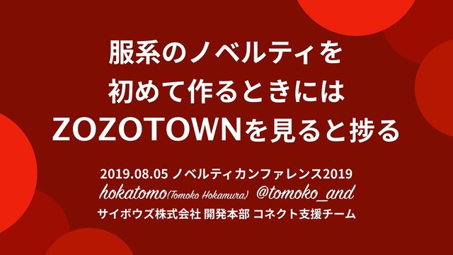 服系のノベルティを 初めて作るときには ZOZOTOWNを⾒ると捗る 2019.08.05 ノベルティカンファレンス2019 hokatomo(Tomoko Hokamura) @tomoko_and サイボウズ株式会社 開発本部