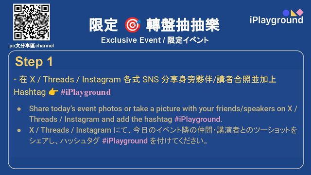 Join the spinning wheel activity at the entrance check-in area for a chance to win a mystery gift! 1/4 chance to win the grand prize — a mug. Limited quantity, while supplies last! • 入口受付エリアのルーレットに参加すると、神秘的なプレゼントが当たるチャンス! 4 分の1の確率で特賞のマグカップが当たります。数量限定、なくなり次第終了! Exclusive Event / 限定イベント Step 3 po文分享區channel