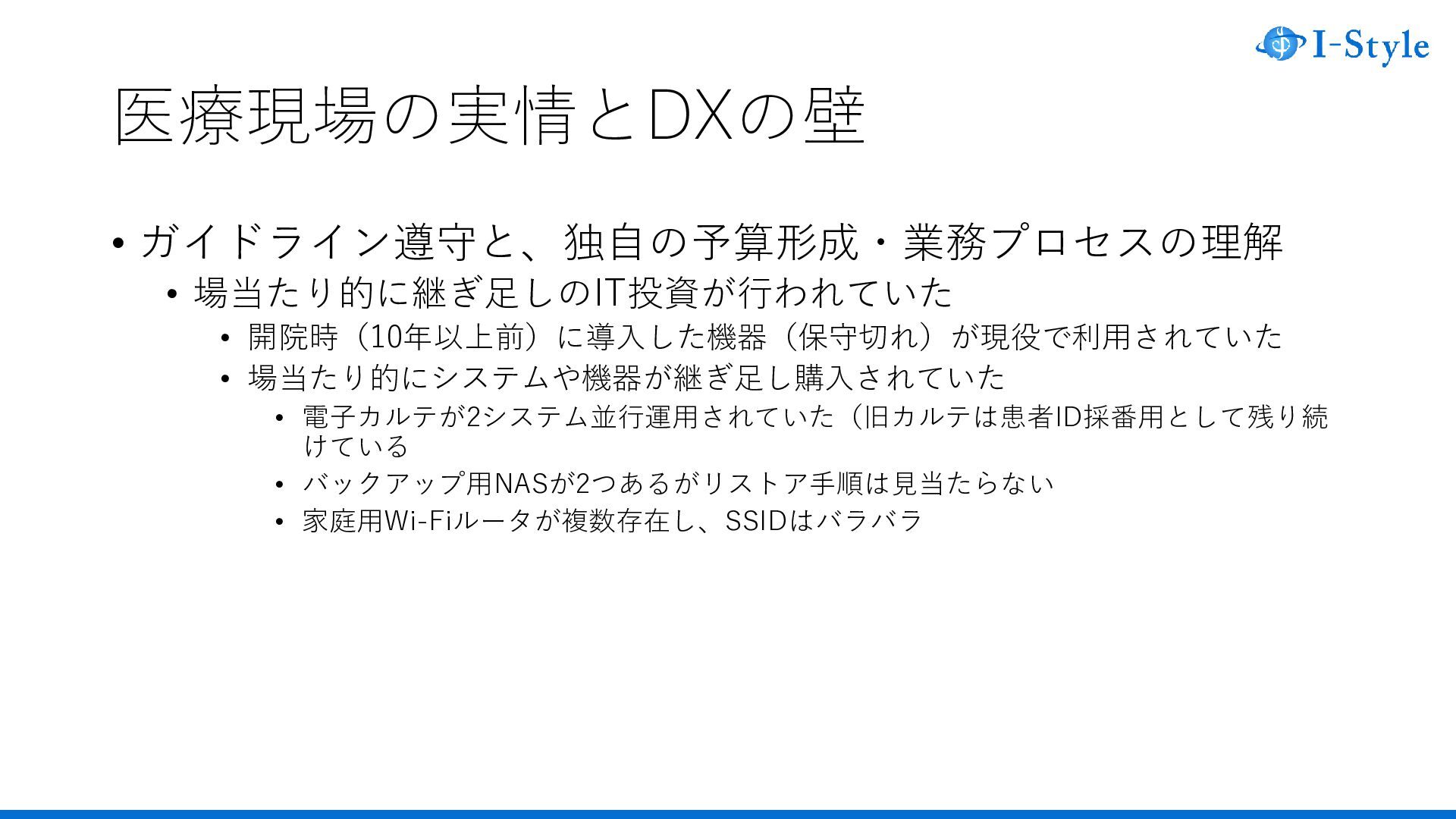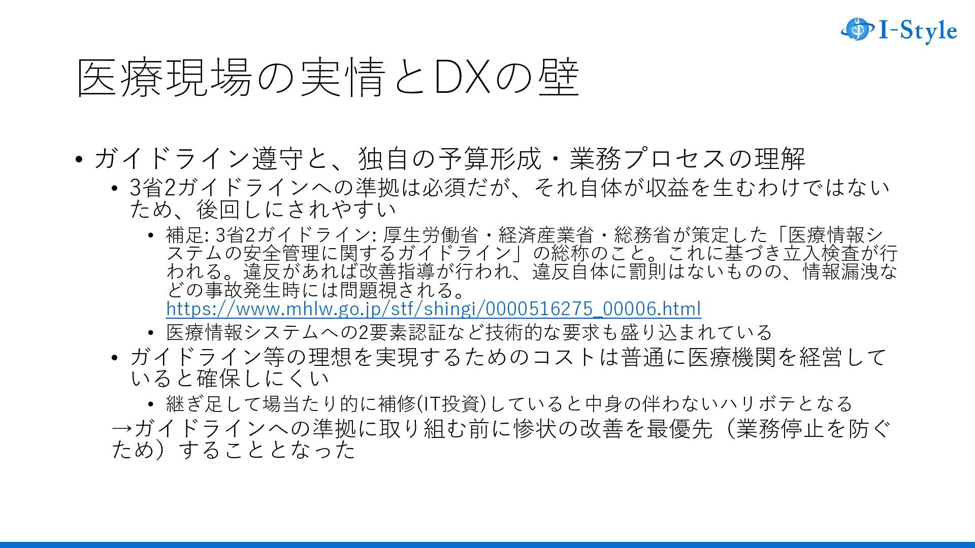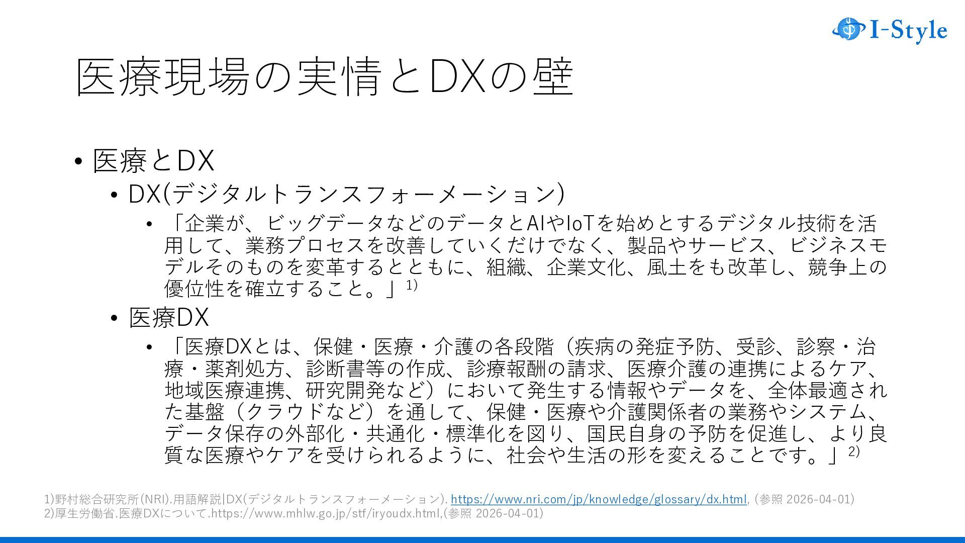 • 医療DX • 「医療DXとは、保健・医療・介護の各段階(疾病の発症予防、受診、診察・治 療・薬剤処方、診断書等の作成、診療報酬の請求、医療介護の連携によるケア、 地域医療連携、研究開発など)において発生する情報やデータを、全体最適され た基盤(クラウドなど)を通して、保健・医療や介護関係者の業務やシステム、 データ保存の外部化・共通化・標準化を図り、国民自身の予防を促進し、より良 質な医療やケアを受けられるように、社会や生活の形を変えることです。」2) 1)野村総合研究所(NRI).用語解説|DX(デジタルトランスフォーメーション). https://www.nri.com/jp/knowledge/glossary/dx.html, (参照 2026-04-01) 2)厚生労働省.医療DXについて.https://www.mhlw.go.jp/stf/iryoudx.html,(参照 2026-04-01)