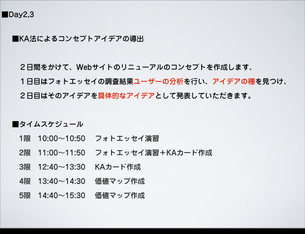 ˙%BZ ˙,"๏ʹΑΔίϯηϓτΞΠσΞͷಋग़ ɹ̎ؒΛ͔͚ͯɺ8FCαΠτͷϦχϡʔΞϧͷίϯηϓτΛ࡞͠·͢ɺ ɹ̍ϑΥτΤοηΠͷௐࠪ݁ՌϢʔβʔͷੳΛߦ͍ɺΞΠσΞͷछΛݟ͚ͭɺ ɹ̎ͦͷΞΠσΞΛ۩ମతͳΞΠσΞͱͯ͠ൃද͍͖ͯͨͩ͠·͢ɻ ˙λΠϜεέδϡʔϧɹ ɹݶɹʙɹϑΥτΤοηΠԋश ɹݶɹʙɹϑΥτΤοηΠԋशʴ,"Χʔυ࡞ ɹݶɹʙɹ,"Χʔυ࡞