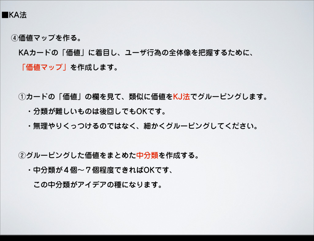 ˙,"๏ ᶆՁϚοϓΛ࡞Δɻ ɹ,"ΧʔυͷʮՁʯʹண͠ɺϢʔβߦҝͷશମ૾ΛѲ͢ΔͨΊʹɺ ɹʮՁϚοϓʯΛ࡞͠·͢ɻ ɹᶃΧʔυͷʮՁʯͷཝΛݟͯɺྨࣅʹՁΛ,+๏Ͱάϧʔϐϯά͠·͢ɻ ɹɹɾྨ͕͍͠ͷޙճ͠Ͱ0,Ͱ͢ɻ ɹɹɾແཧΓ͚ͬͭ͘ΔͷͰͳ͘ɺࡉ͔͘άϧʔϐϯά͍ͯͩ͘͠͞ɻ ɹᶄάϧʔϐϯάͨ͠ՁΛ·ͱΊͨதྨΛ࡞͢Δɻ ɹɹɾதྨ͕̐ݸʙ̓ݸఔͰ͖Ε0,Ͱ͢ɺ ɹɹɹ͜ͷதྨ͕ΞΠσΞͷछʹͳΓ·͢ɻ