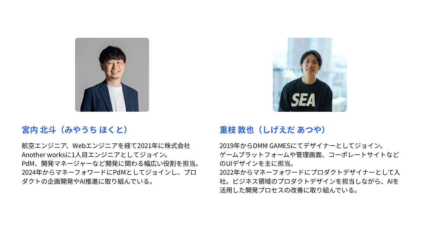 宮内 北⽃(みやうち ほくと) 航空エンジニア、Webエンジニアを経て2021年に株式会社 Another worksに1⼈⽬エンジニアとしてジョイン。 PdM、開発マネージャーなど開発に関わる幅広い役割を担当。 2024年からマネーフォワードにPdMとしてジョインし、プロ ダクトの企画開発やAI推進に取り組んでいる。 重枝