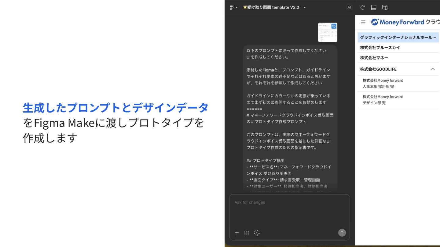 ⽣成したプロンプトとデザインデータ をFigma Makeに渡しプロトタイプを 作成します