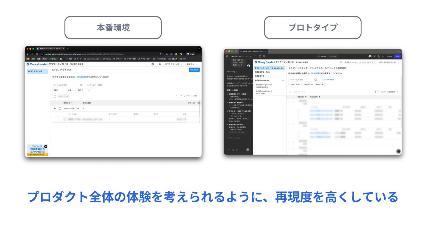 プロダクト全体の体験を考えられるように、再現度を⾼くしている 本番環境 プロトタイプ
