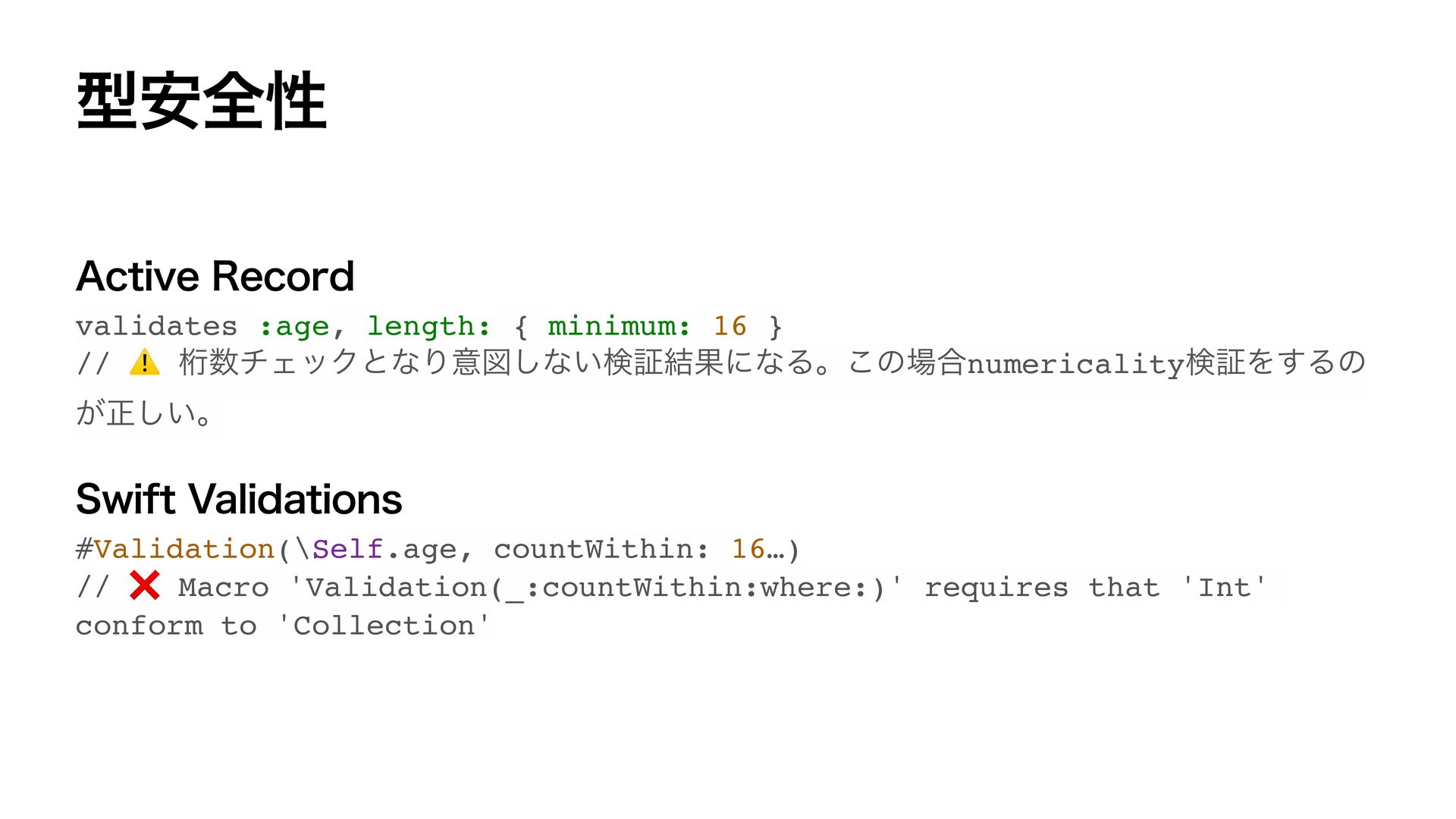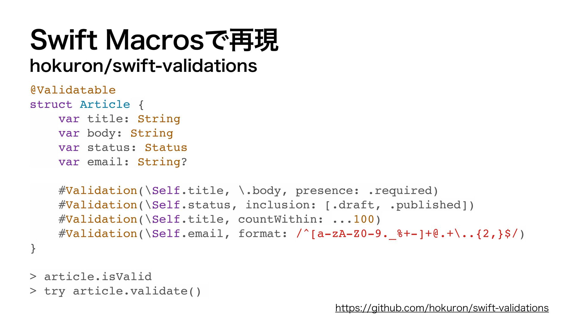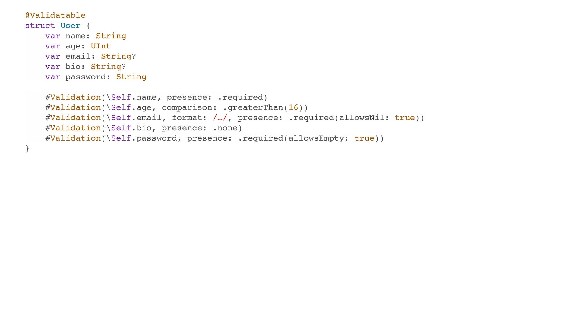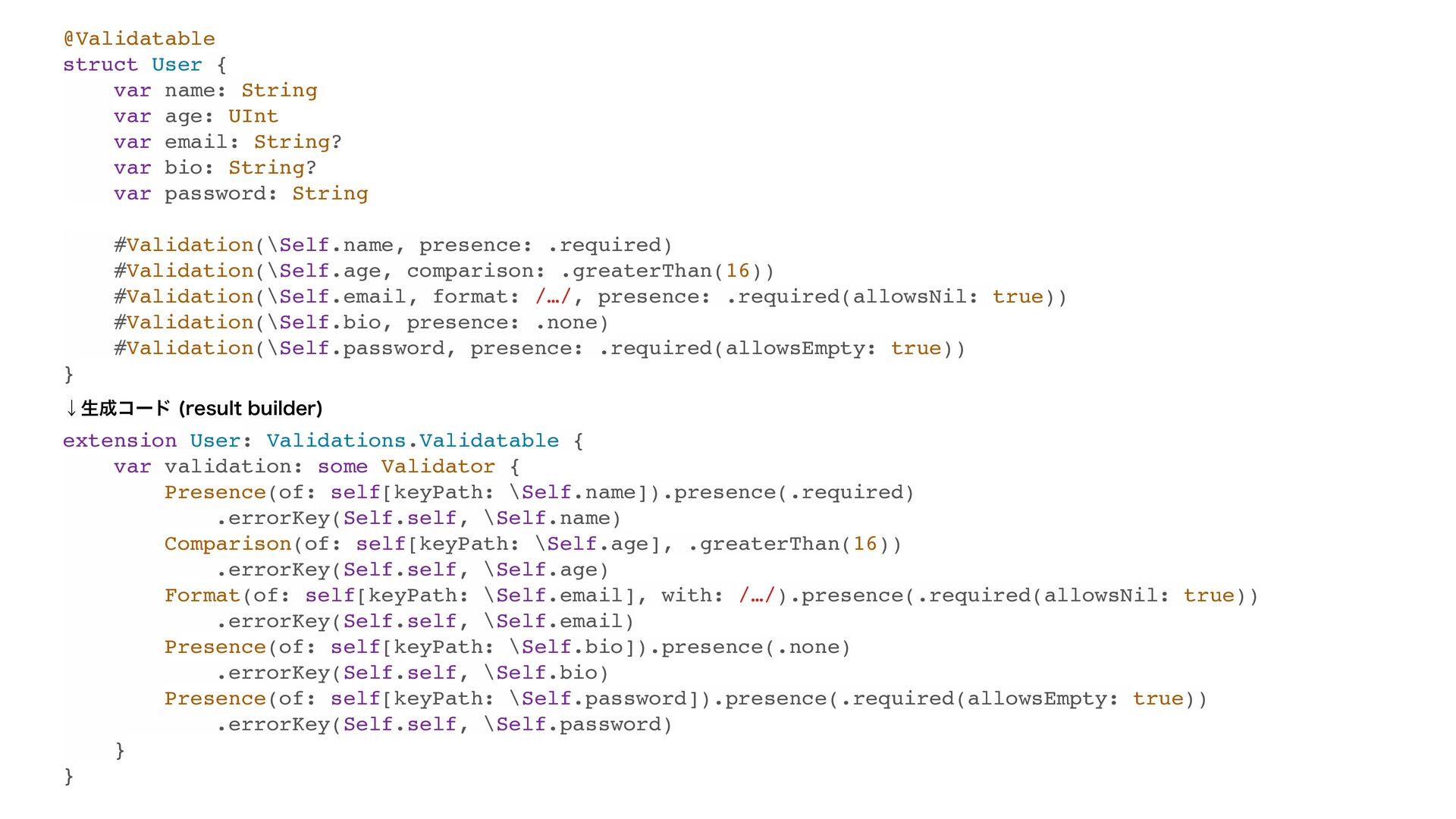 var email: String? var bio: String? var password: String #Validation(\Self.name, presence: .required) #Validation(\Self.age, comparison: .greaterThan(16)) #Validation(\Self.email, format: /…/, presence: .required(allowsNil: true)) #Validation(\Self.bio, presence: .none) #Validation(\Self.password, presence: .required(allowsEmpty: true)) } ˣੜίʔυ SFTVMUCVJMEFS extension User: Validations.Validatable { var validation: some Validator { Presence(of: self[keyPath: \Self.name]).presence(.required) .errorKey(Self.self, \Self.name) Comparison(of: self[keyPath: \Self.age], .greaterThan(16)) .errorKey(Self.self, \Self.age) Format(of: self[keyPath: \Self.email], with: /…/).presence(.required(allowsNil: true)) .errorKey(Self.self, \Self.email) Presence(of: self[keyPath: \Self.bio]).presence(.none) .errorKey(Self.self, \Self.bio) Presence(of: self[keyPath: \Self.password]).presence(.required(allowsEmpty: true)) .errorKey(Self.self, \Self.password) } }