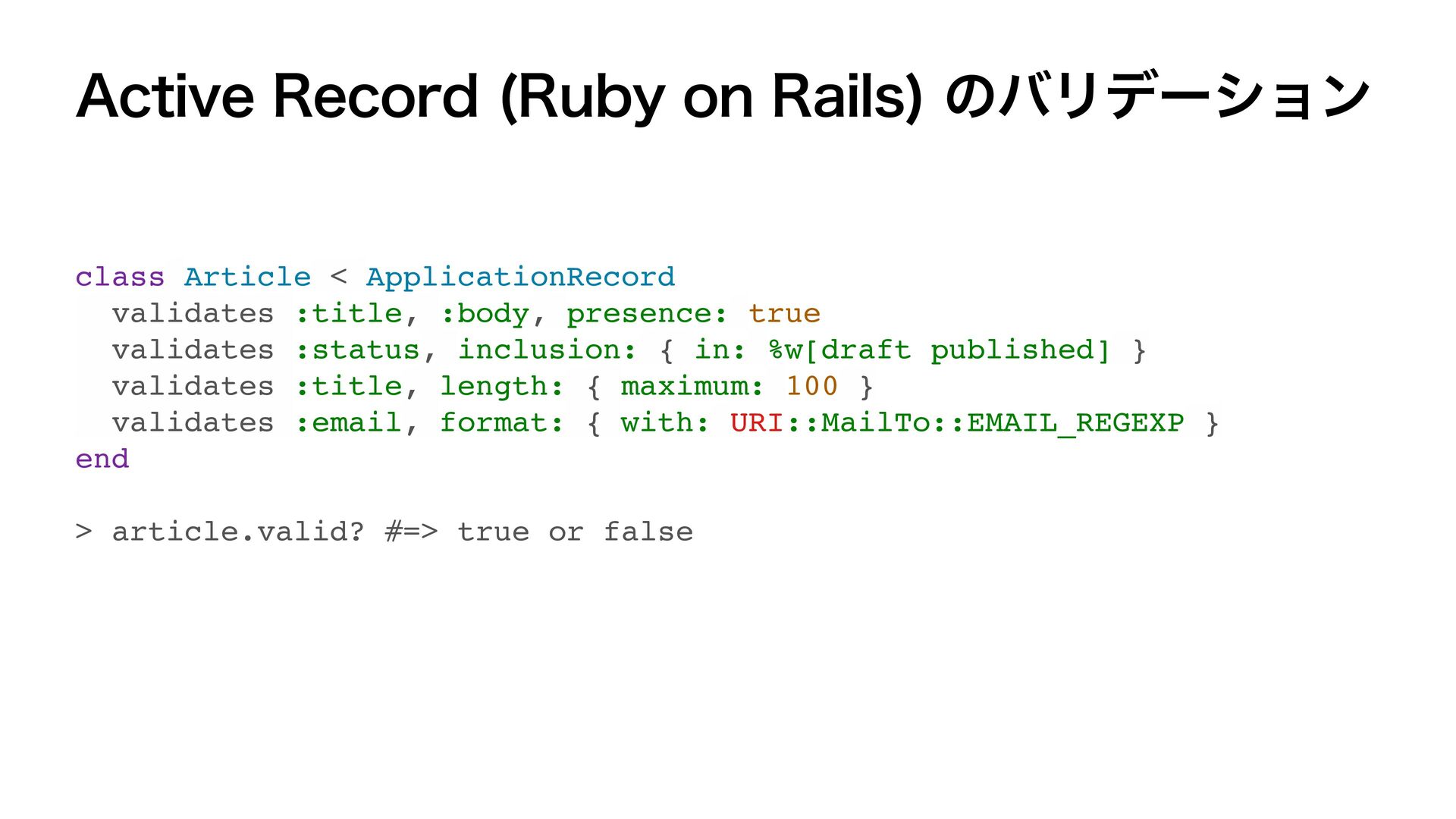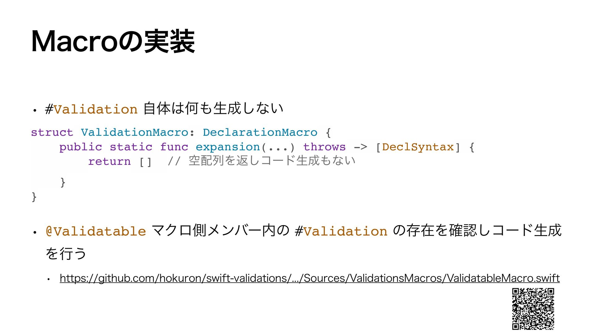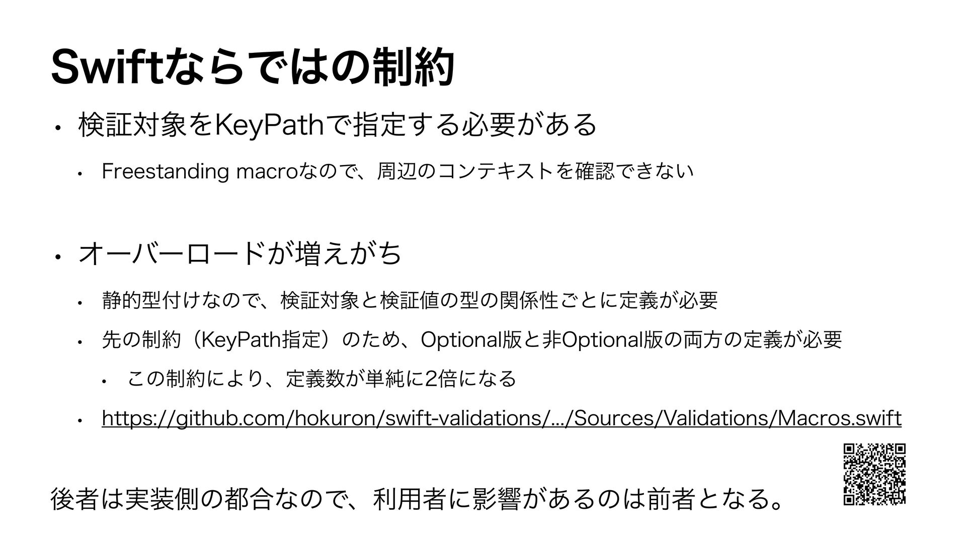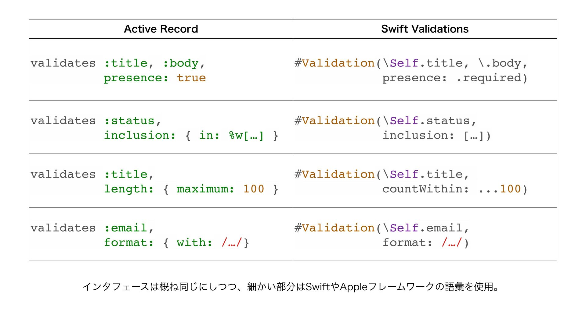var email: String? var bio: String? var password: String #Validation(\Self.name, presence: .required) #Validation(\Self.age, comparison: .greaterThan(16)) #Validation(\Self.email, format: /…/, presence: .required(allowsNil: true)) #Validation(\Self.bio, presence: .none) #Validation(\Self.password, presence: .required(allowsEmpty: true)) } ˣੜίʔυ SFTVMUCVJMEFS extension User: Validations.Validatable { var validation: some Validator { Presence(of: self[keyPath: \Self.name]).presence(.required) .errorKey(Self.self, \Self.name) Comparison(of: self[keyPath: \Self.age], .greaterThan(16)) .errorKey(Self.self, \Self.age) Format(of: self[keyPath: \Self.email], with: /…/).presence(.required(allowsNil: true)) .errorKey(Self.self, \Self.email) Presence(of: self[keyPath: \Self.bio]).presence(.none) .errorKey(Self.self, \Self.bio) Presence(of: self[keyPath: \Self.password]).presence(.required(allowsEmpty: true)) .errorKey(Self.self, \Self.password) } }