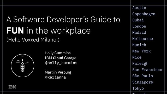 Raleigh San Francisco São Paulo Singapore Tokyo A Software Developer’s Guide to FUN in the workplace (Hello Voxxed Milano!) Holly Cummins IBM Cloud Garage @holly_cummins Martijn Verburg @karianna