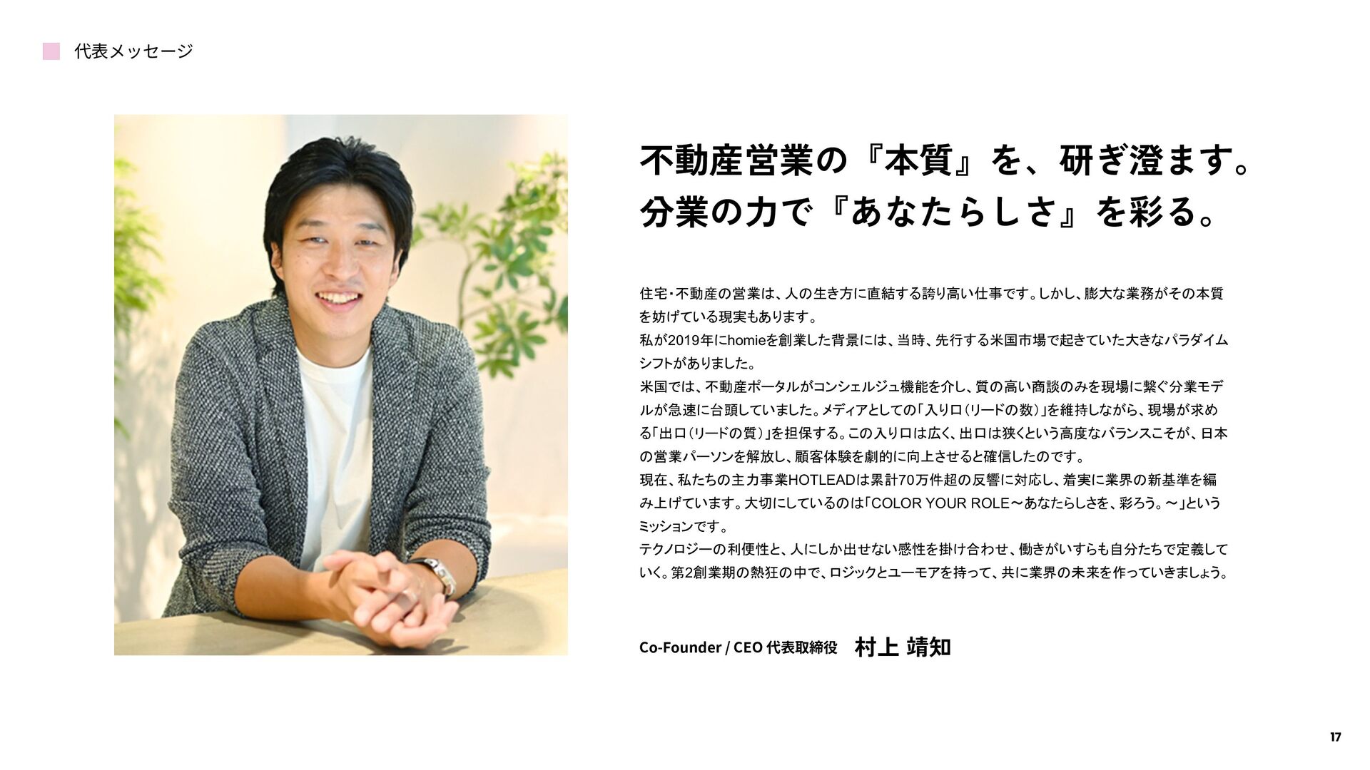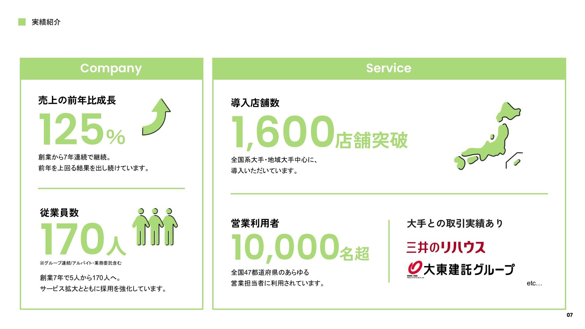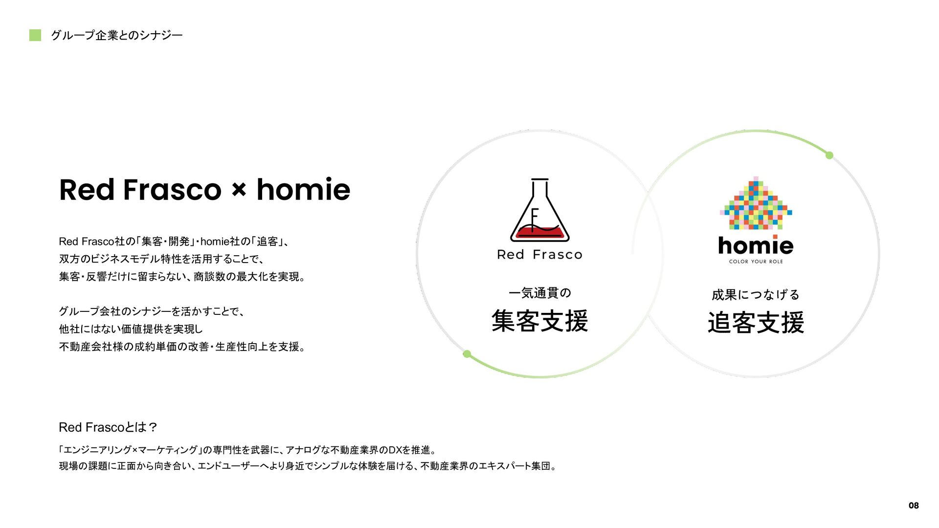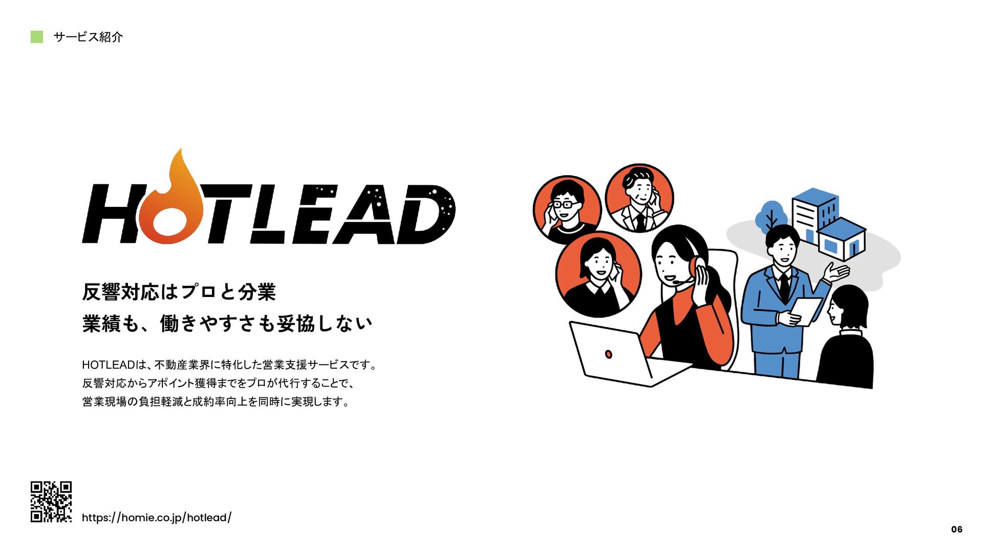 4月 複数の個人投資家からの第3社割当増資により 5,700万円の資金調達を実施 6月 「HOTLEAD」不動産売買向けサービスリリース 2021 4月 「HOTLEAD」不動産賃貸向けサービスリリース 6月 「HOTLEAD」注文住宅向けサービスリリース 7月 導入店舗数100店舗突破 2022 5月 +SHIFT TSUKIJI(東京都中央区)へオフィス移転 7月 第三者割当増資により1億円の資金調達を実施 2023 6月 導入店舗数500店舗突破 2024 1月 アレトゥーサ渋谷(東京都渋谷区)へオフィス移転 2月 「HOTLEAD」不動産売却向けサービスリリース 10月 導入店舗数1000店舗突破 2025 1月 株式会社Red Frascoと経営統合 10月 導入店舗数1500店舗突破