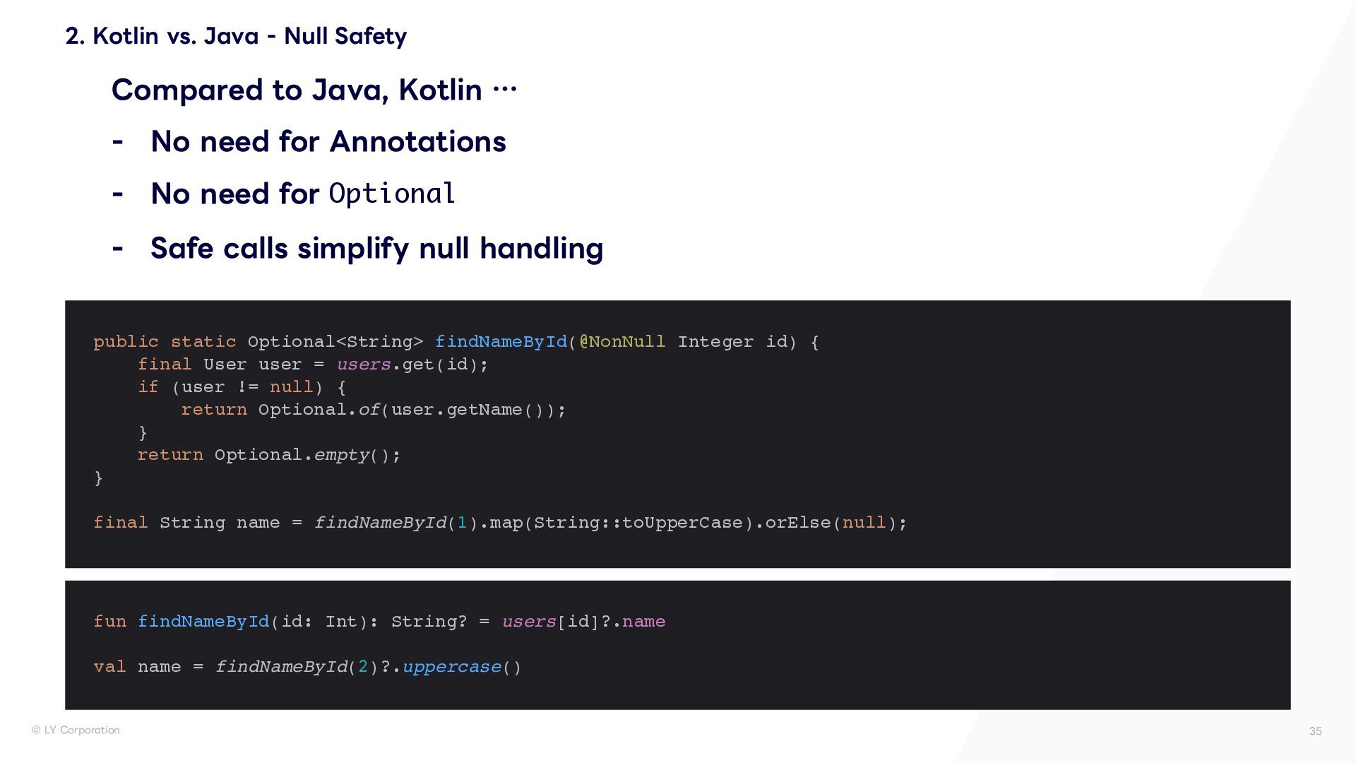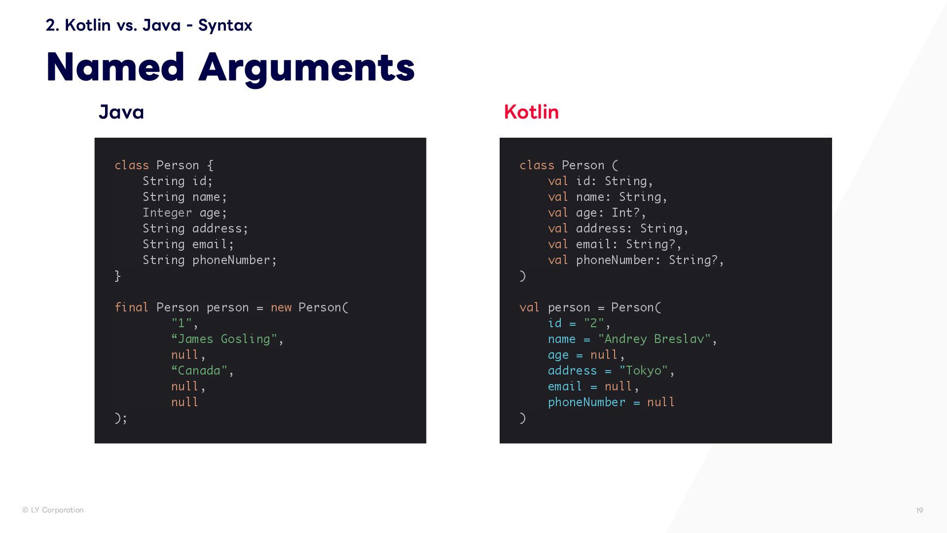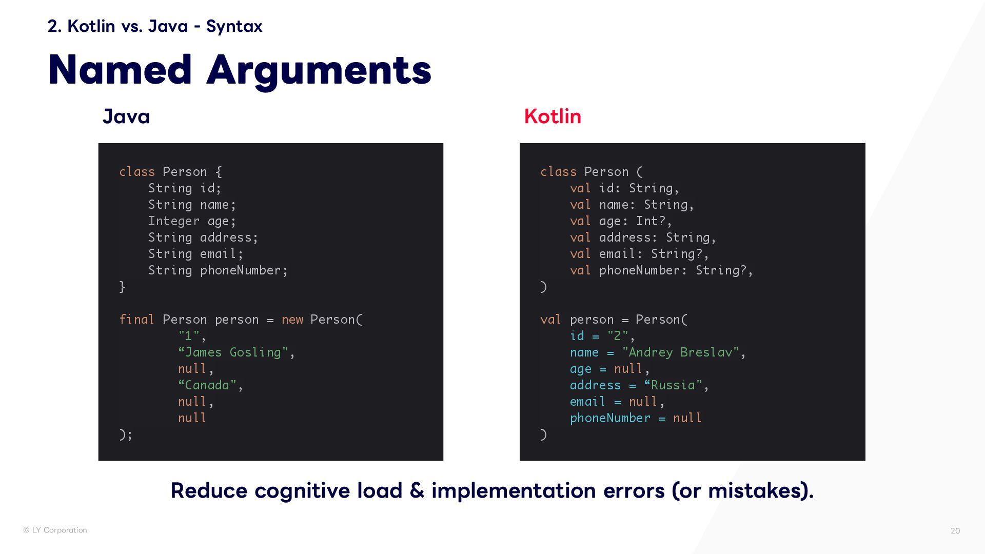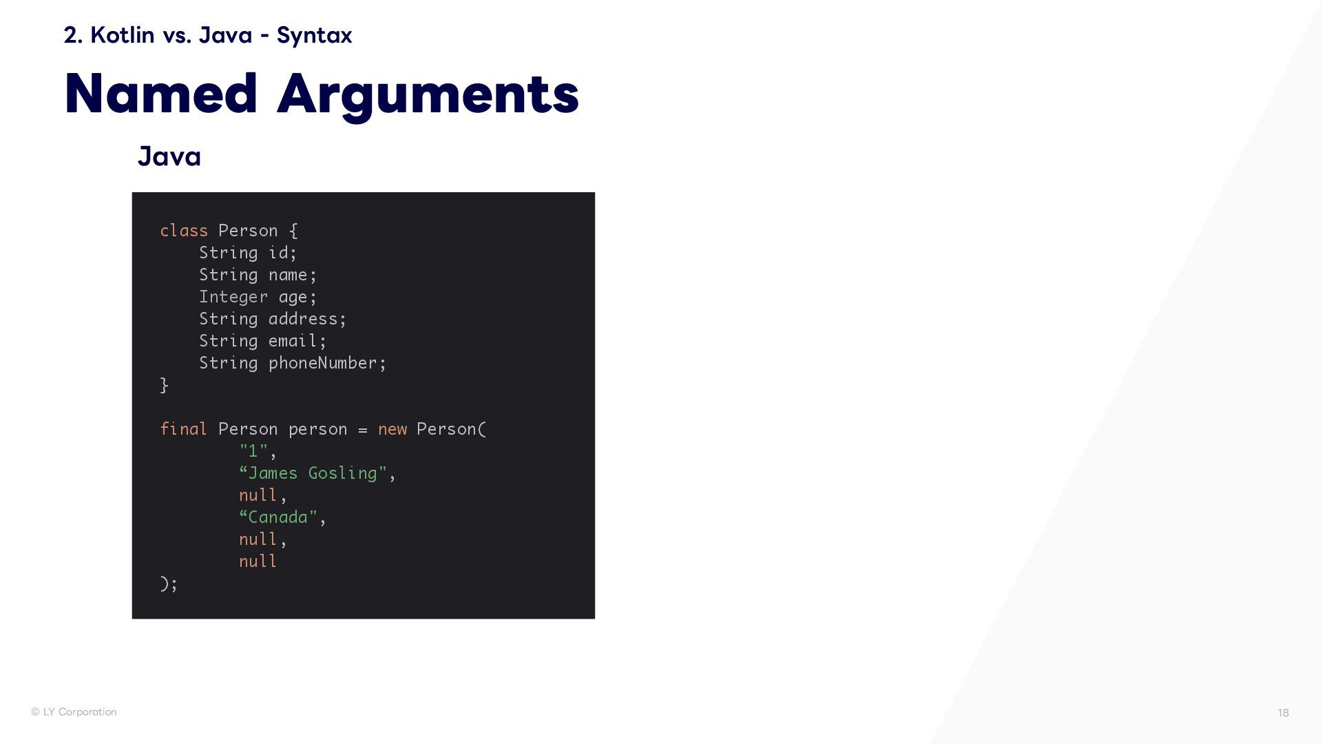name; Integer age; String address; String email; String phoneNumber; } final Person person = new Person( "1", “James Gosling", null, “Canada", null, null ); +BWB class Person ( val id: String, val name: String, val age: Int?, val address: String, val email: String?, val phoneNumber: String?, ) val person = Person( id = "2", name = "Andrey Breslav", age = null, address = “Russia", email = null, phoneNumber = null ) ,PUMJO 3FEVDFDPHOJUJWFMPBEJNQMFNFOUBUJPOFSSPST PSNJTUBLFT