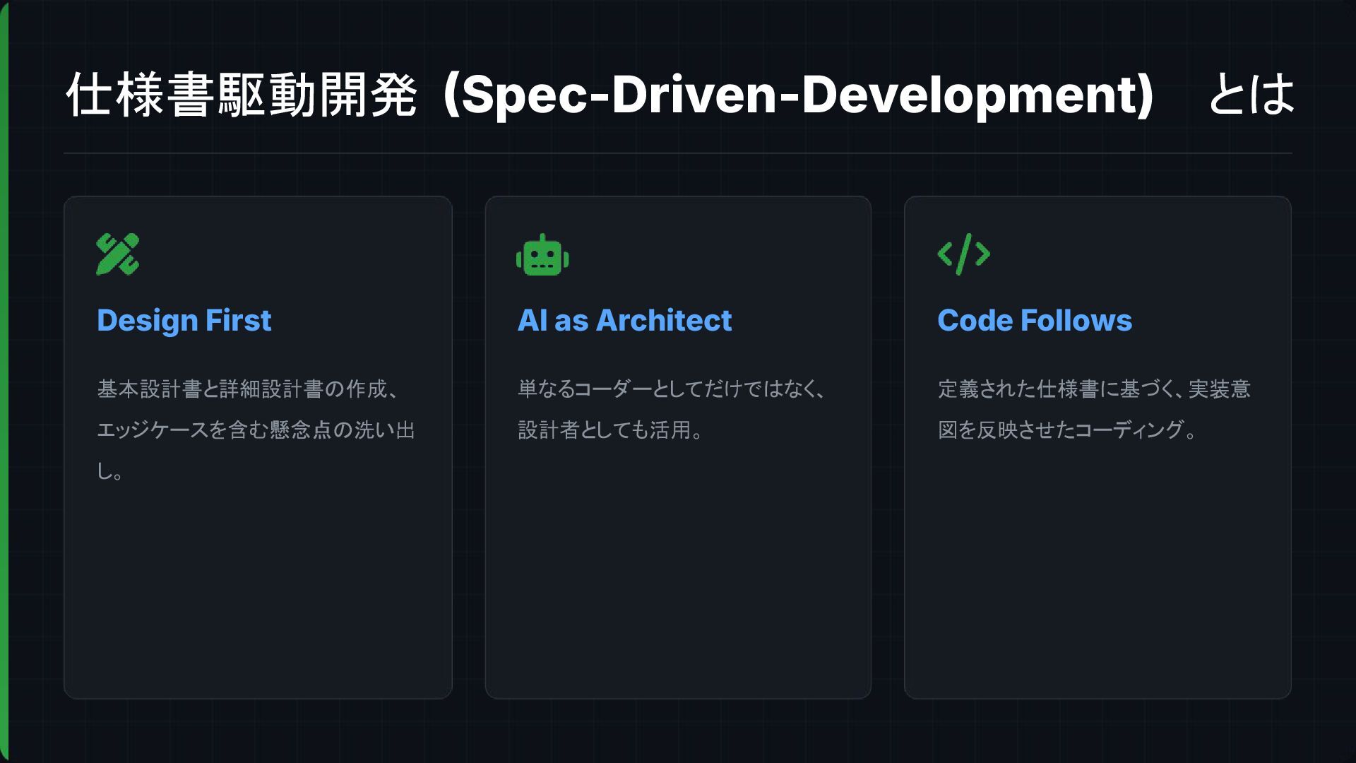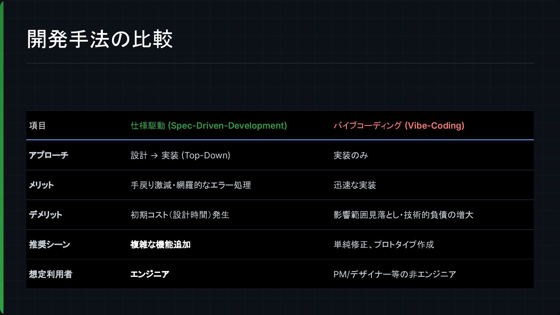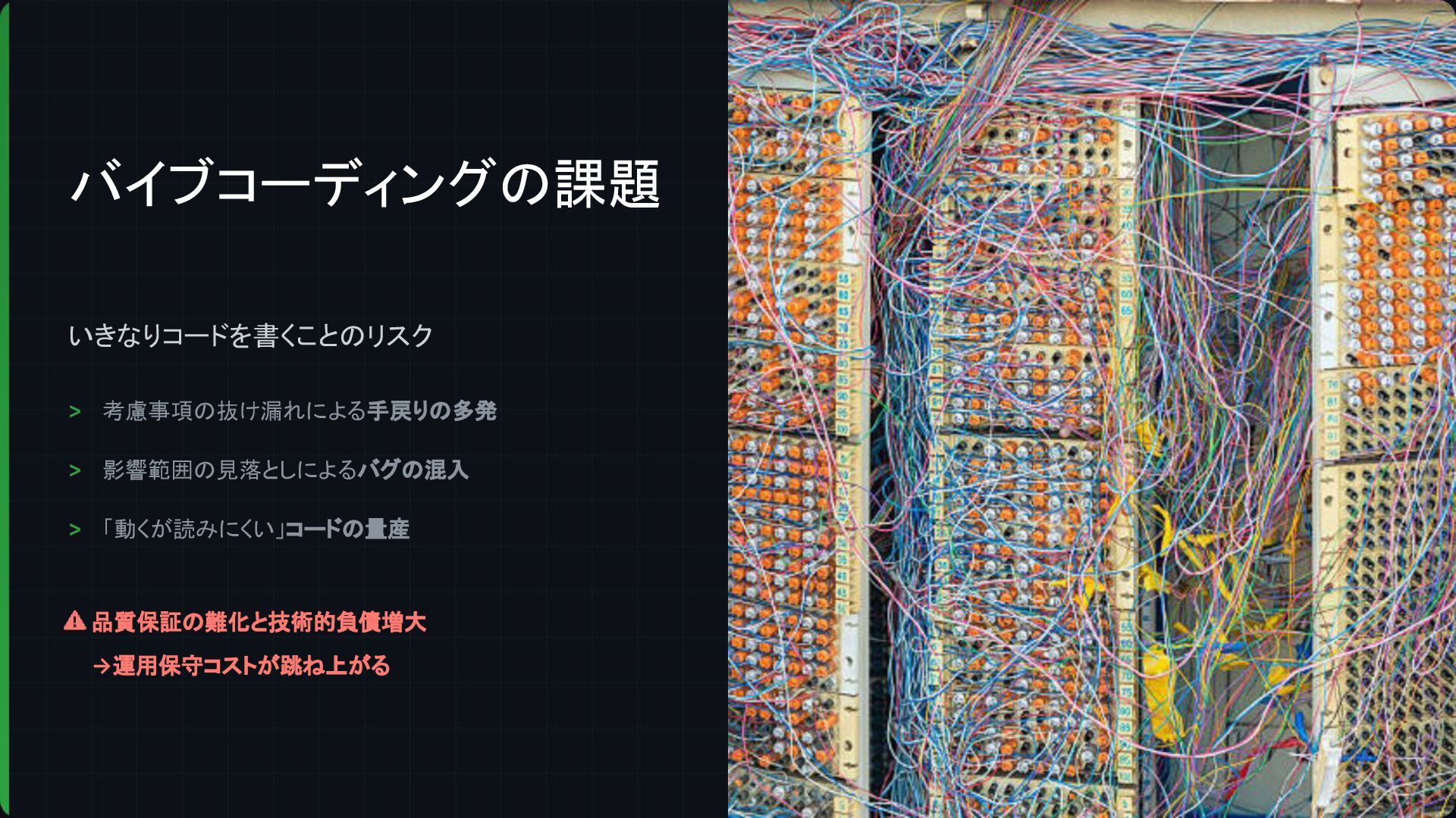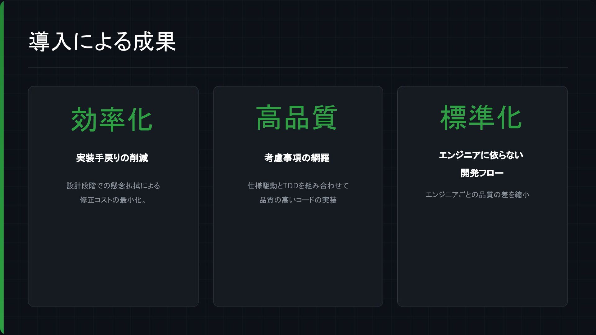 昨今、バイブコーディングによる手軽な開発手法が話題となっていますが、その代償として品質の担保が課題となっています。また、技術的負債の蓄積により運用保守コストが増大するリスクもあります。 本スライドでは、仕様書駆動開発とTDDプロセスをAI駆動実装に組み込んだ開発手法について解説します。これにより、AIを活用した開発の効率性と品質を両立できます。