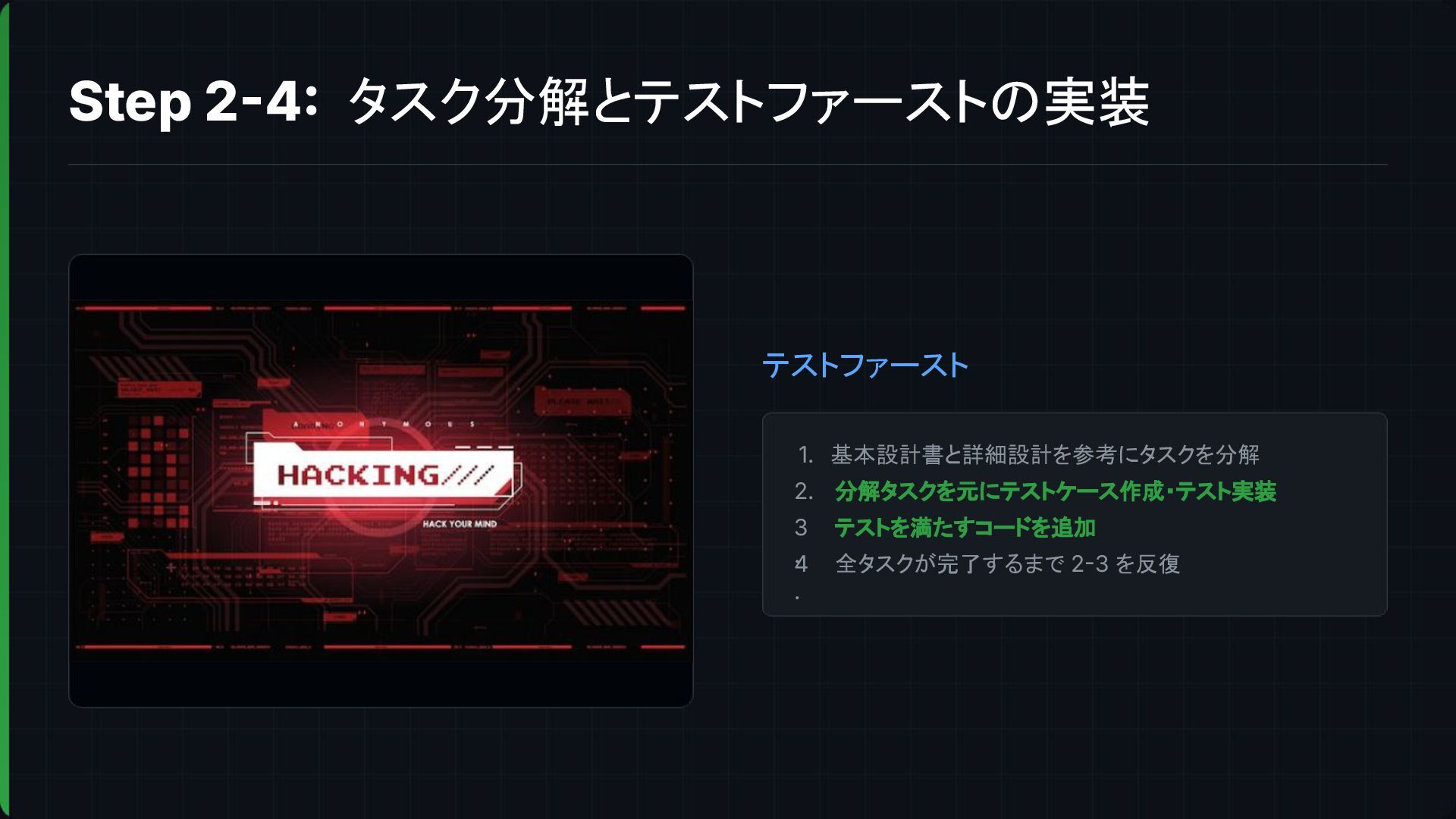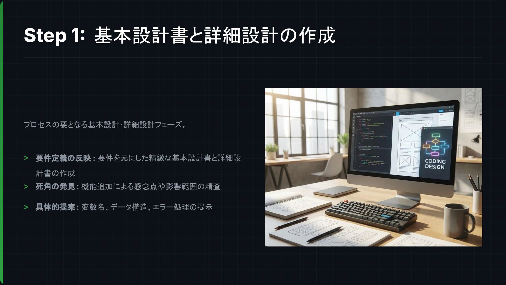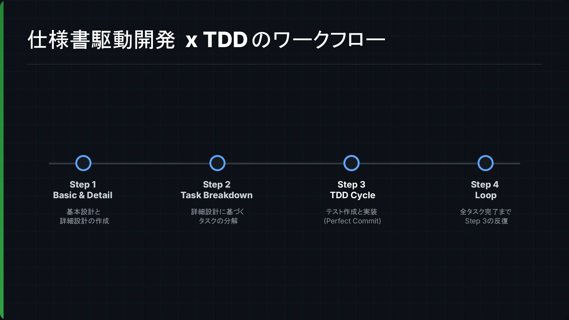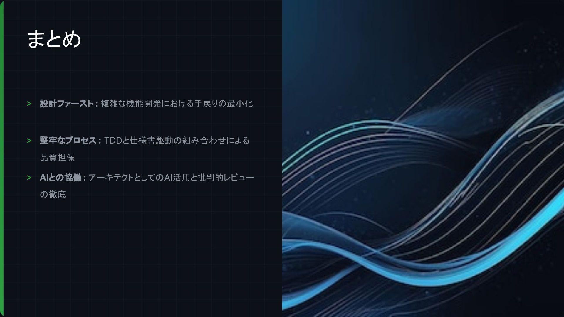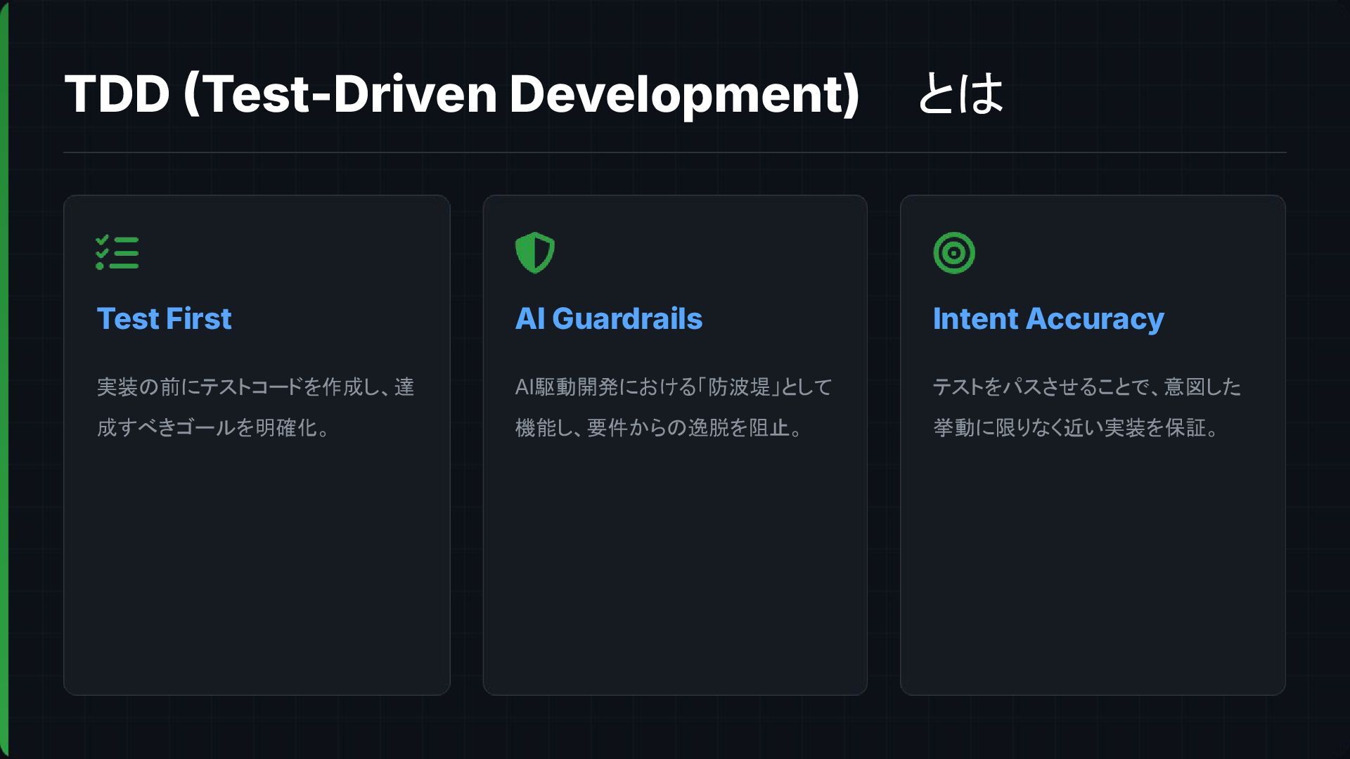 昨今、バイブコーディングによる手軽な開発手法が話題となっていますが、その代償として品質の担保が課題となっています。また、技術的負債の蓄積により運用保守コストが増大するリスクもあります。 本スライドでは、仕様書駆動開発とTDDプロセスをAI駆動実装に組み込んだ開発手法について解説します。これにより、AIを活用した開発の効率性と品質を両立できます。