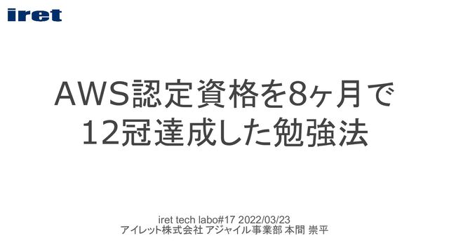 AWS認定資格を8ヶ月で 12冠達成した勉強法 iret tech labo#17 2022/03/23 アイレット株式会社 アジャイル事業部 本間 崇平