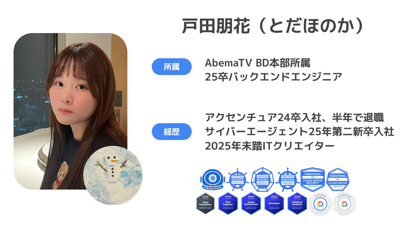 戸田朋花(とだほのか) AbemaTV BD本部所属 25卒バックエンドエンジニア 所属 アクセンチュア24卒入社、半年で退職 サイバーエージェント25年第二新卒入社 2025年未踏ITクリエイター 経歴