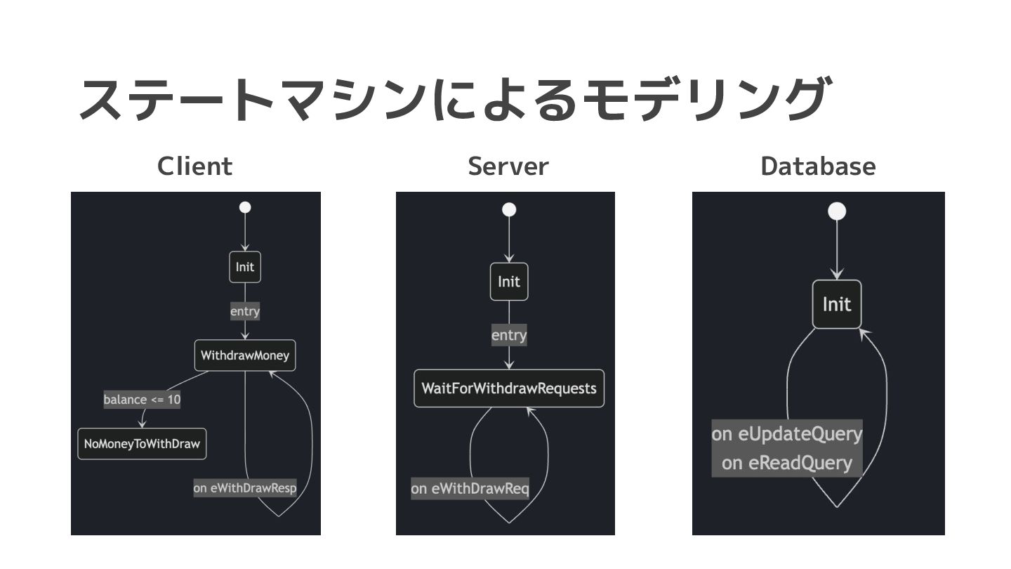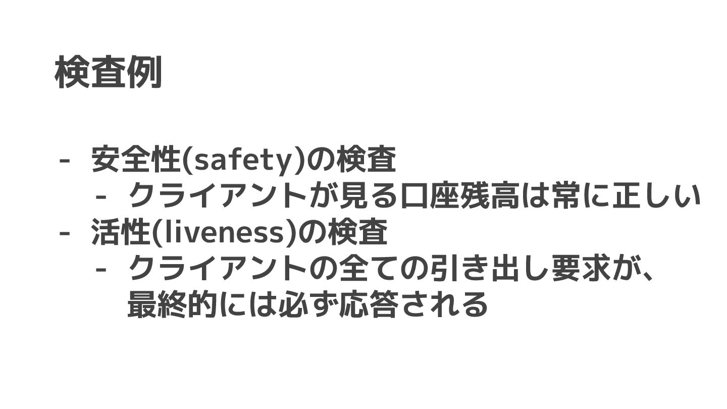 - 安全性(safety)の検査 - クライアントが見る口座残高は常に正しい - 活性(liveness)の検査 - クライアントの全ての引き出し要求が、 最終的には必ず応答される 検査例