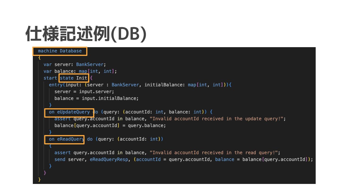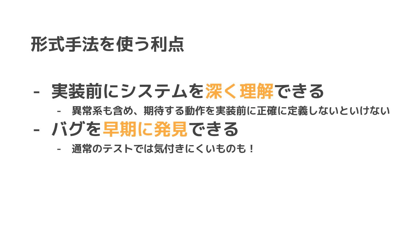 形式手法を使う利点 - 実装前にシステムを深く理解できる - 異常系も含め、期待する動作を実装前に正確に定義しないといけない - バグを早期に発見できる - 通常のテストでは気付きにくいものも!