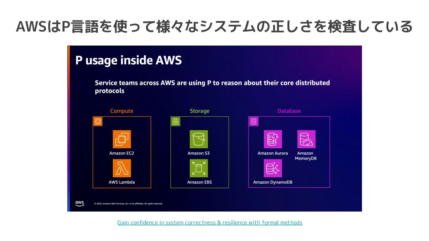AWSはP言語を使って様々なシステムの正しさを検査している Gain confidence in system correctness & resilience with formal