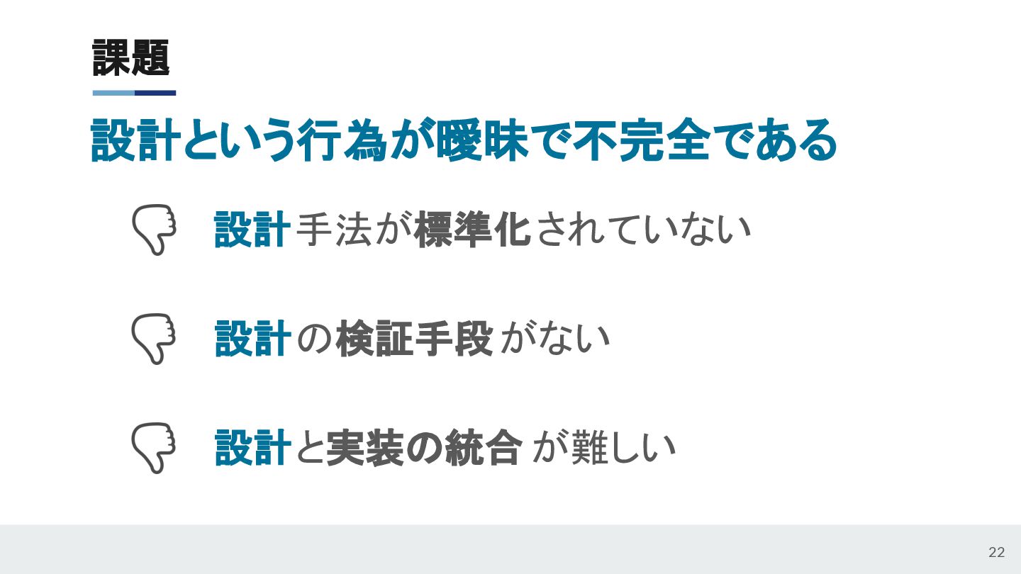 課題 22 設計手法が標準化されていない 設計の検証手段がない 設計と実装の統合 が難しい 設計という行為が曖昧で不完全である
