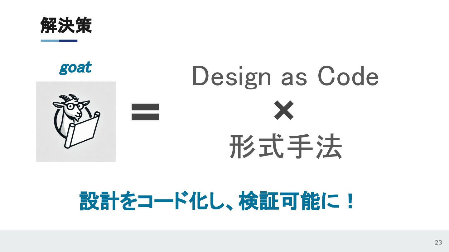 解決策 Design as Code 23 形式手法 goat 設計をコード化し、検証可能に!