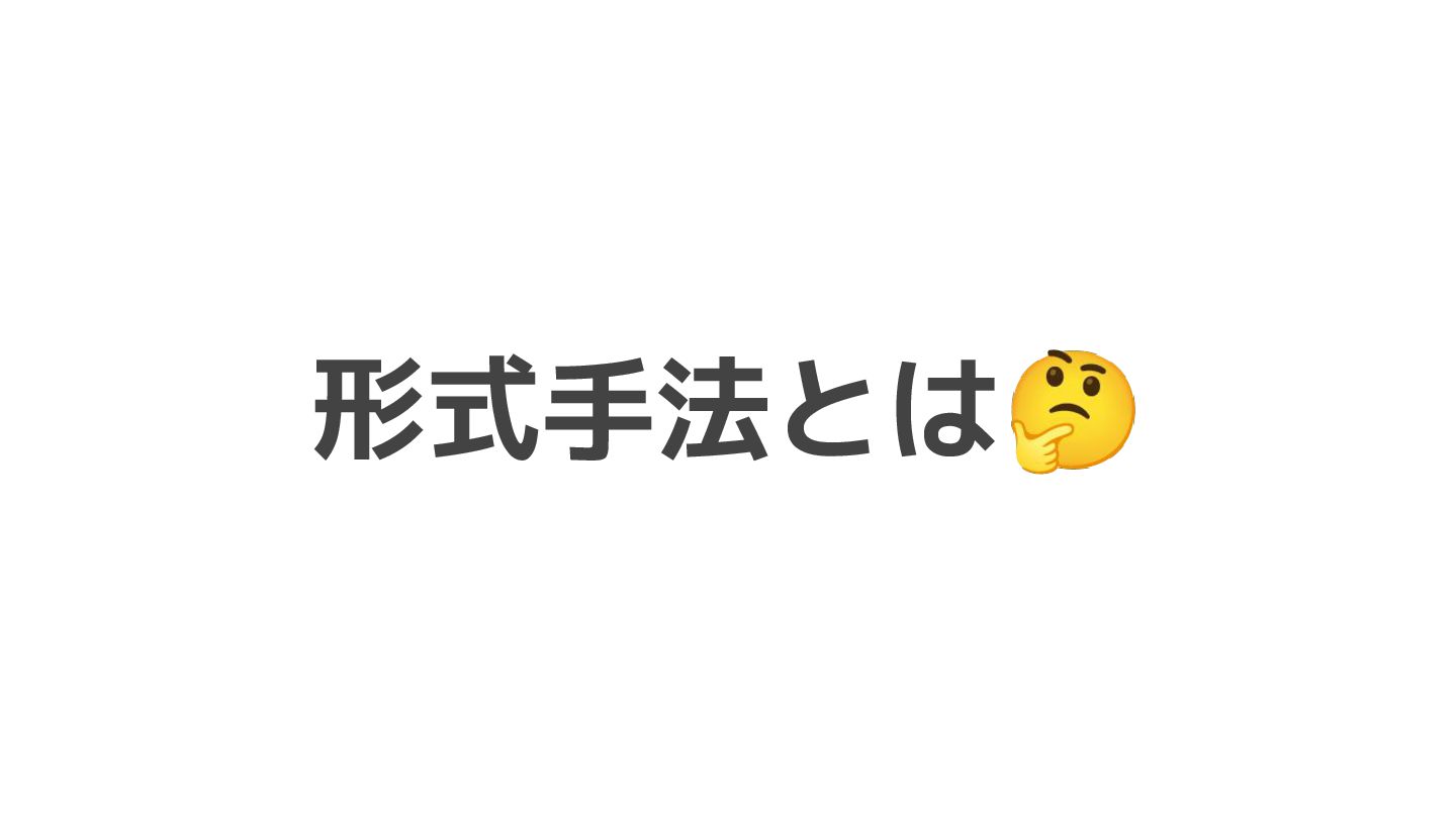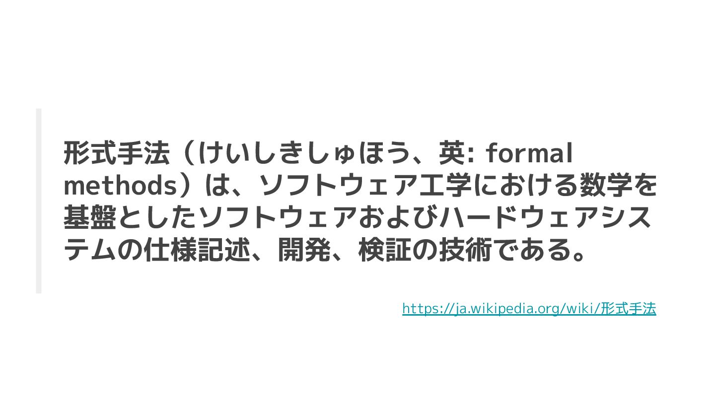 形式手法(けいしきしゅほう、英: formal methods)は、ソフトウェア工学における数学を 基盤としたソフトウェアおよびハードウェアシス テムの仕様記述、開発、検証の技術である。 https://ja.wikipedia.org/wiki/形式手法