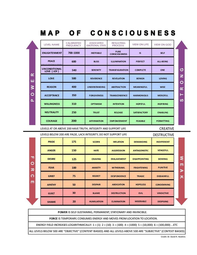 I O U S N E S S INDIFFERENT VENGEFUL DENYING PUNITIVE DISDAINFUL CONDEMNING VINDICTIVE DESPISING PRIDE ANGER DESIRE FEAR GRIEF APATHY GUILT SHAME 175 150 125 100 75 50 30 20 SCORN HATE CRAVING ANXIETY REGRET DESPAIR BLAME HUMILIATION INFLATION AGGRESSION ENSLAVEMENT WITHDRAWL DESPONDENCE ABDICATION DESTRUCTION ELIMINATION DEMANDING ANTAGONISTIC DISAPPOINTING FRIGHTENING TRAGIC HOPELESS EVIL MISERABLE P O W E R S T R O N G W E A K F O R C E CREATIVE DESTRUCTIVE LEVELS AT OR ABOVE 200 HAVE TRUTH, INTEGRITY AND SUPPORT LIFE LEVELS BELOW 200 ARE FALSE, LACK INTEGRITY, DO NOT SUPPORT LIFE POWER IS SELF-SUSTAINING, PERMANENT, STATIONARY AND INVINCIBLE. FORCE IS TEMPORARY, CONSUMES ENERGY AND MOVES FROM LOCATION TO LOCATION. ENERGY FIELD INCREASES LOGARITHMICALLY: 1 = (1) 2 = (10) 3 = (100) 4 = (1000) 5 = (10,000) 6 = (100,000) ...ETC ALL LEVELS BELOW 500 ARE “OBJECTIVE” (CONTENT BIASED) AND ALL LEVELS ABOVE 500 ARE “SUBJECTIVE” (CONTEXT BIASED) VIEW ON GOD SELF ALL-BEING ONE LOVING WISE MERCIFUL INSPIRING ENABLING PERMITTING VIEW ON LIFE IS PERFECT COMPLETE BENIGN MEANINGFUL HARMONIOUS HOPEFUL SATISFACTORY FEASIBLE CALIBRATED FREQUENCY 700-1000 600 540 500 400 350 310 250 200 ASSOCIATED EMOTIONAL STATE INEFFABLE BLISS SERENITY REVERENCE UNDERSTANDING FORGIVENESS OPTIMISM TRUST AFFIRMATION RESULTING PROCESS PURE CONSCIOUSNESS ILLUMINATION TRANSFIGURATION REVELATION ABSTRACTION TRANSCENDENCE INTENTION RELEASE EMPOWERMENT (LEVEL OF SPONTANEOUS HEALING) LEVEL NAME ENLIGHTENMENT PEACE UNCONDITIONAL LOVE [ JOY ] LOVE REASON ACCEPTANCE WILLINGNESS NEUTRALITY COURAGE Credit: Dr. David R. Hawkins
