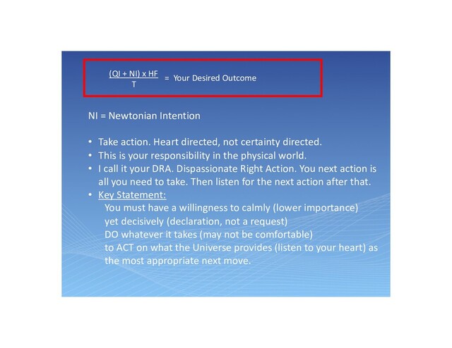 certainty directed. • This is your responsibility in the physical world. • I call it your DRA. Dispassionate Right Action. You next action is all you need to take. Then listen for the next action after that. • Key Statement: You must have a willingness to calmly (lower importance) yet decisively (declaration, not a request) DO whatever it takes (may not be comfortable) to ACT on what the Universe provides (listen to your heart) as the most appropriate next move. (QI + NI) x HF T = Your Desired Outcome