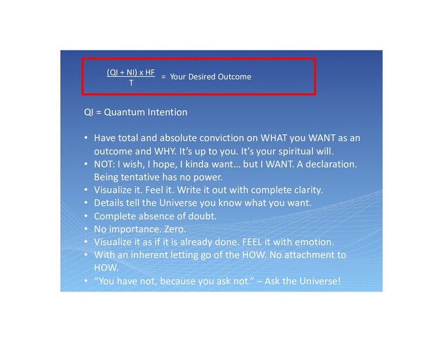 QI = Quantum Intention • Have total and absolute conviction on WHAT you WANT as an outcome and WHY. It’s up to you. It’s your spiritual will. • NOT: I wish, I hope, I kinda want… but I WANT. A declaration. Being tentative has no power. • Visualize it. Feel it. Write it out with complete clarity. • Details tell the Universe you know what you want. • Complete absence of doubt. • No importance. Zero. • Visualize it as if it is already done. FEEL it with emotion. • With an inherent letting go of the HOW. No attachment to HOW. • “You have not, because you ask not.” – Ask the Universe!