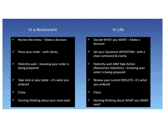 your order - with clarity ü Patiently wait – knowing your order is being prepared ü Take look at your plate – it’s what you ordered ü Enjoy ü Starting thinking about your next meal ü Decide WHAT you WANT – Make a decision ü Set your Quantum INTENTION - with a clear command & clarity ü Patiently wait AND Take Action (Newtonian Intention) – knowing your order is being prepared ü Review your current RESULTS– it’s what you ordered ü Enjoy ü Starting thinking about WHAT you WANT next! In a Restaurant In Life