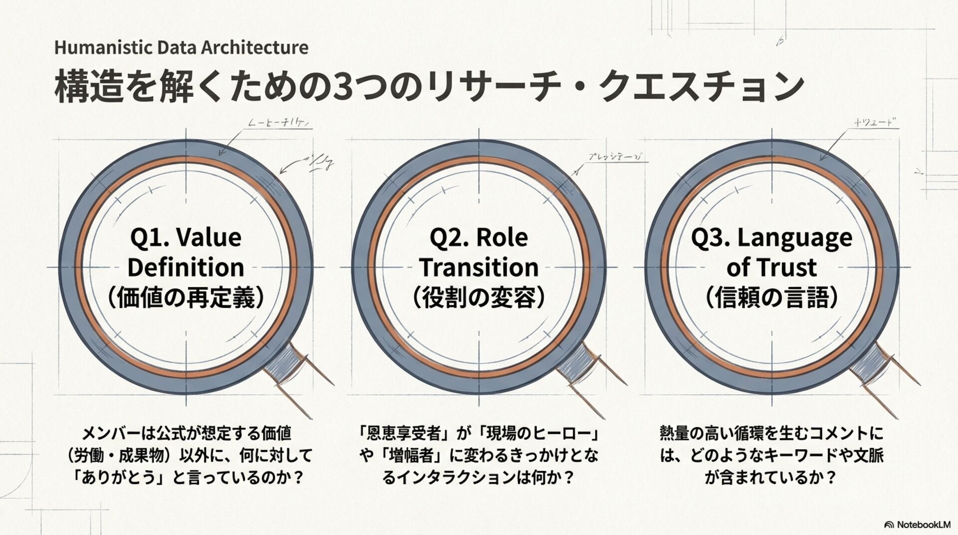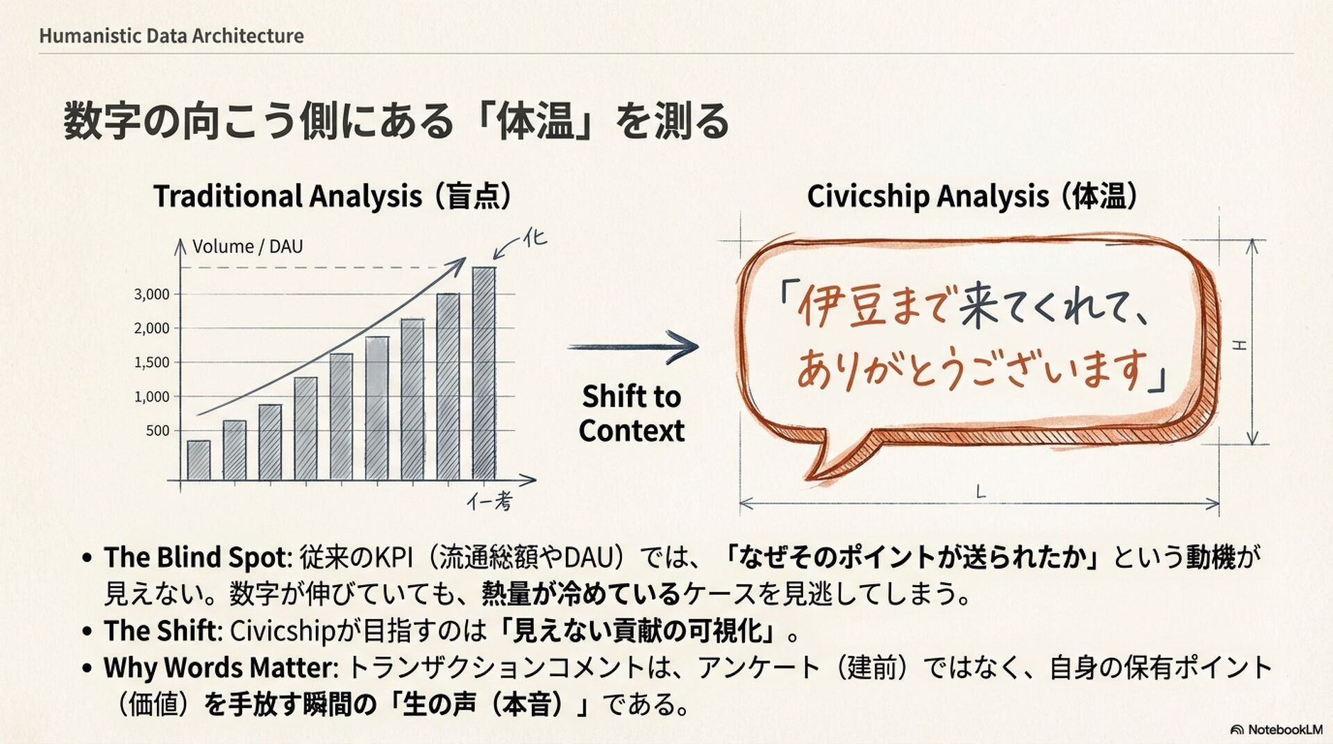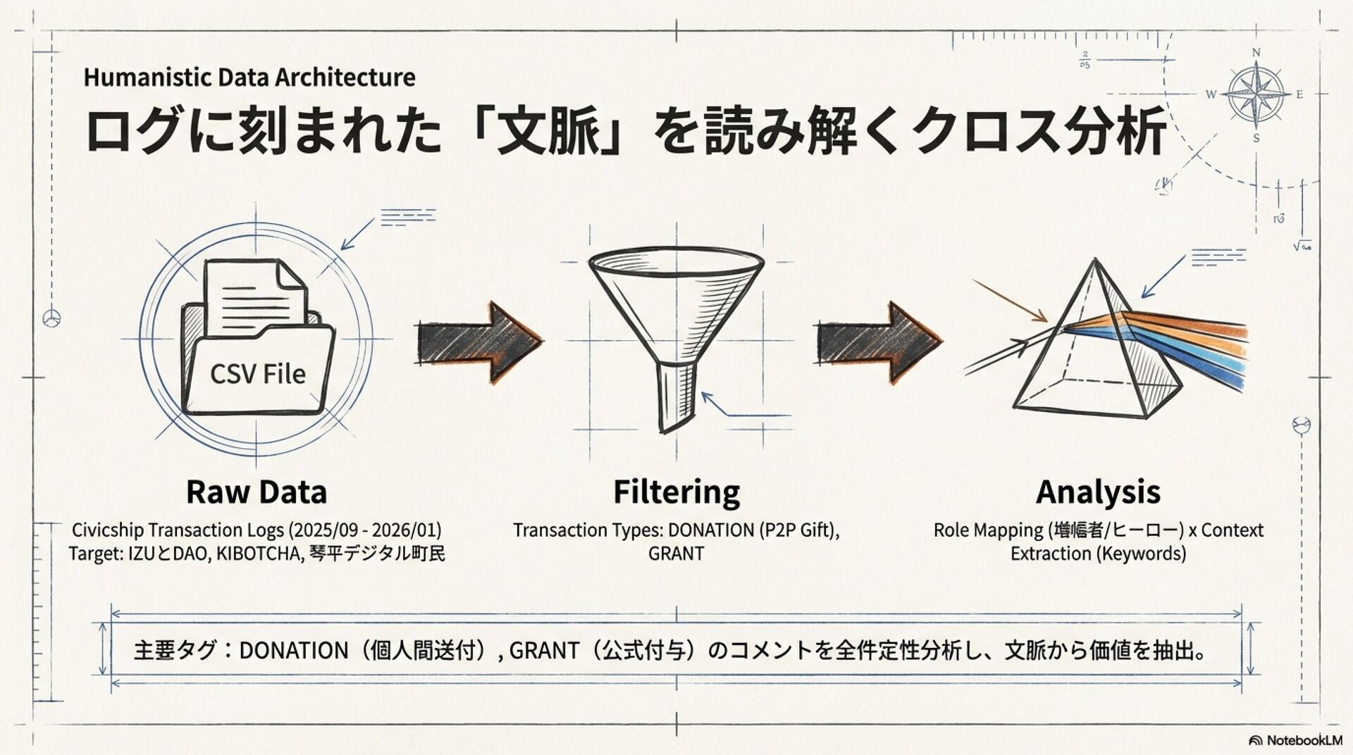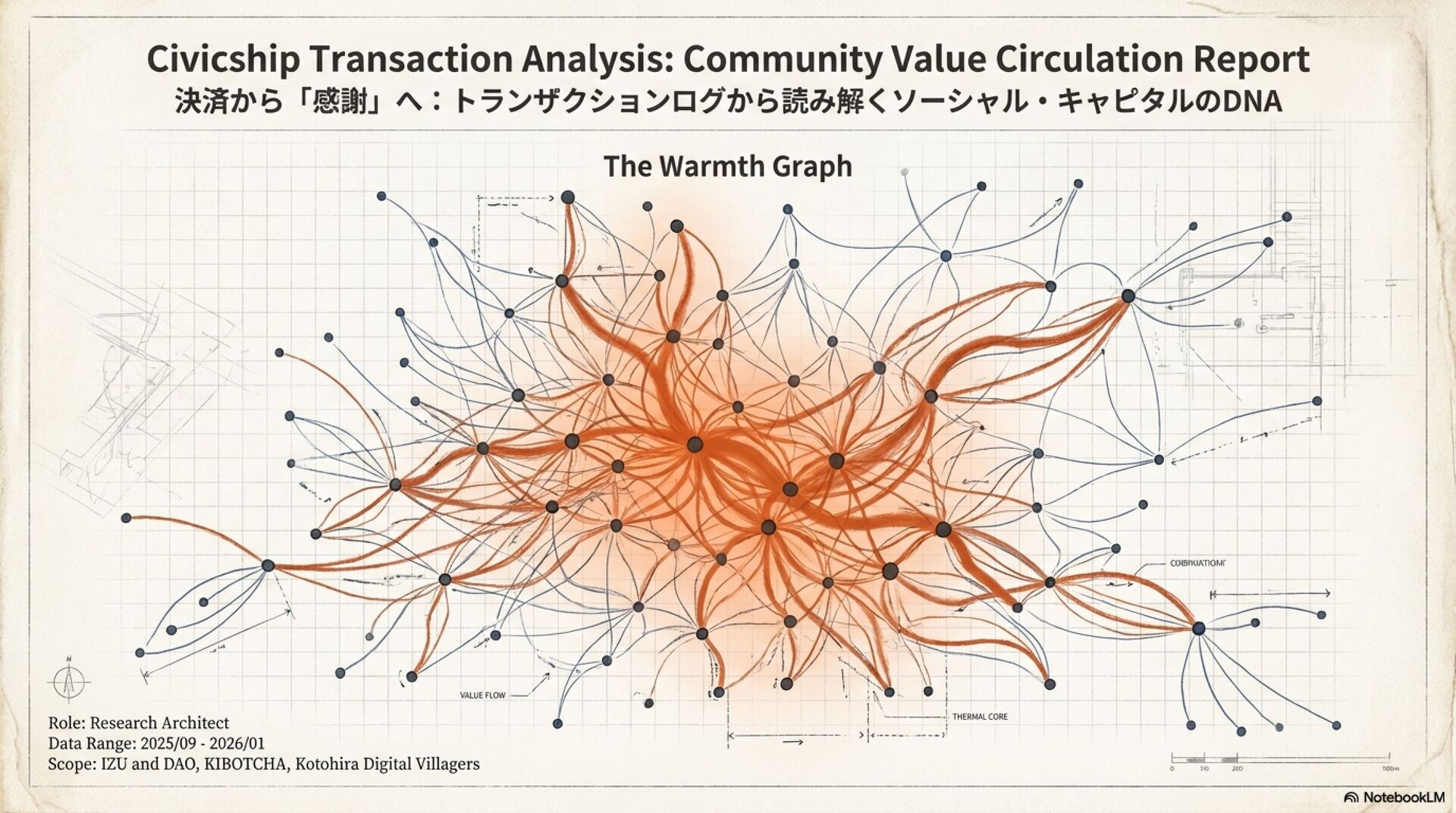 本レポートは、civicship トランザクションログの定性分析を通じ、コミュニティ内の価値循環構造を解明した資料です。2025年9月から2026年1月にかけての「IZUとDAO」「KIBOTCHA」「琴平デジタル町民」のデータを対象とし、従来のKPI(流通総額やDAU)では見落とされがちなコミュニティの「体温(civicship)」を可視化しています。