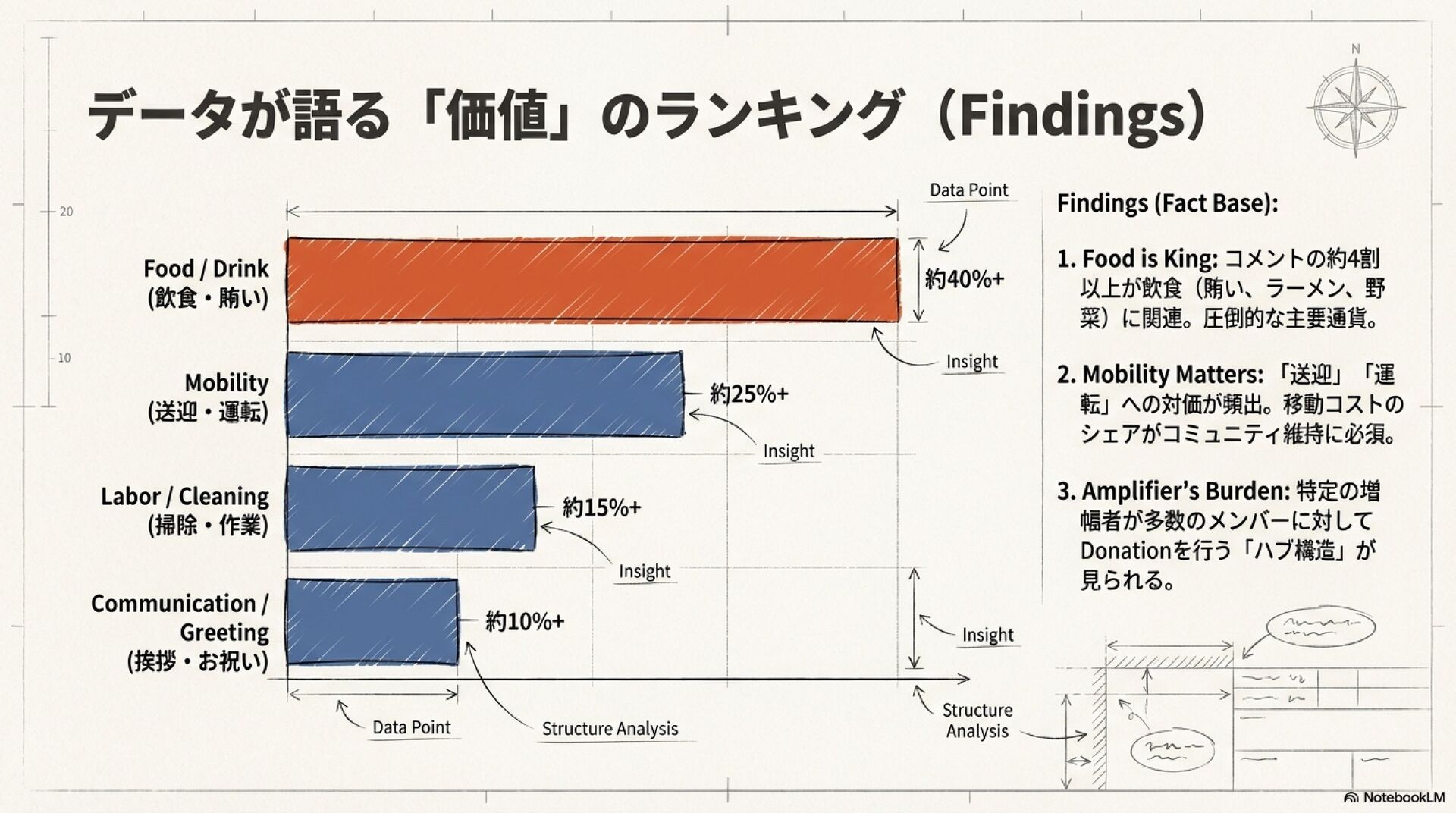 ・Food is King:コメントの約4割以上が飲食(賄い、野菜など)に関連しており、圧倒的な主要通貨となっています。