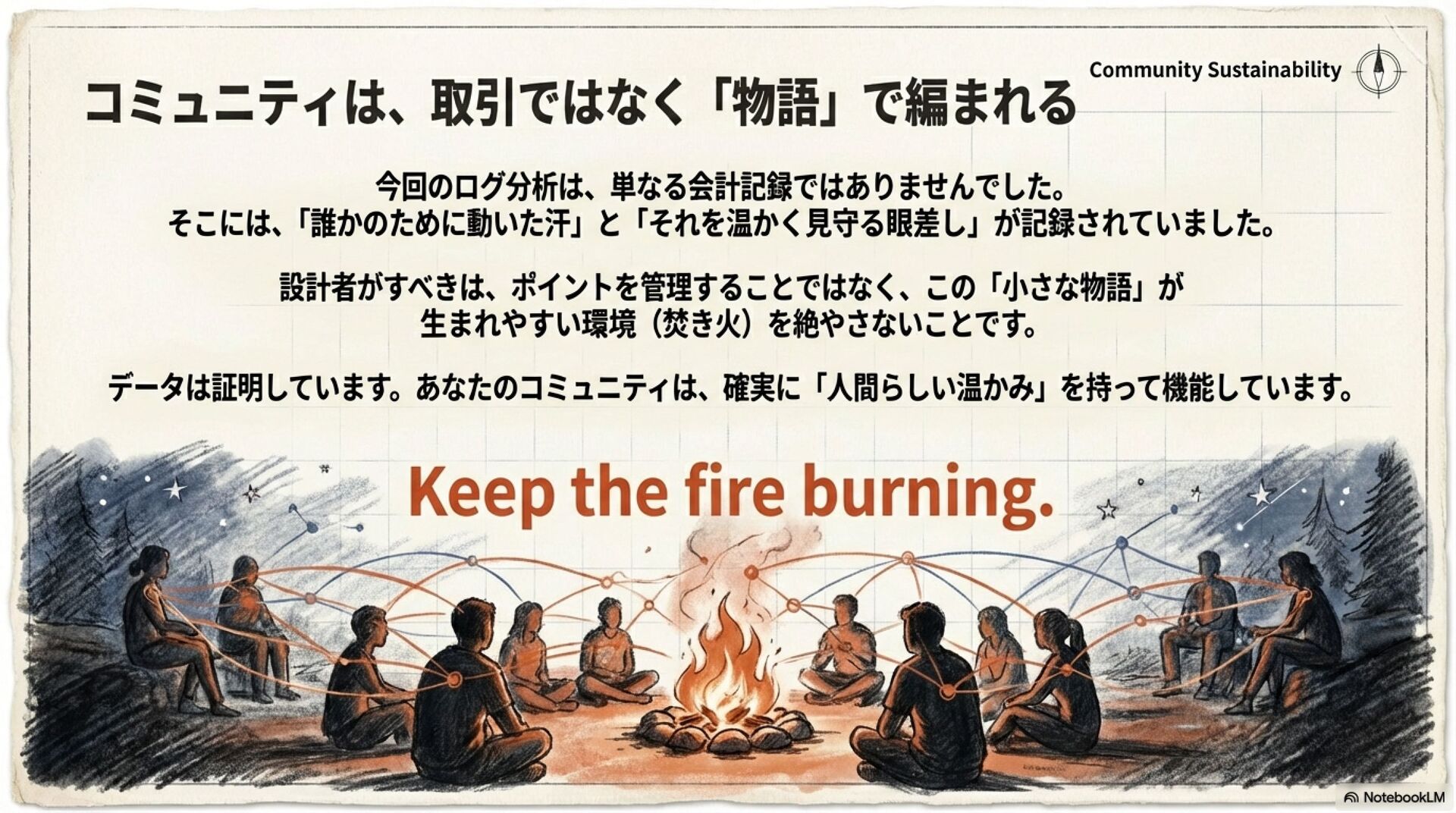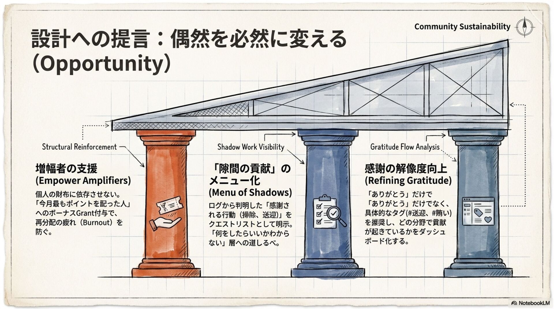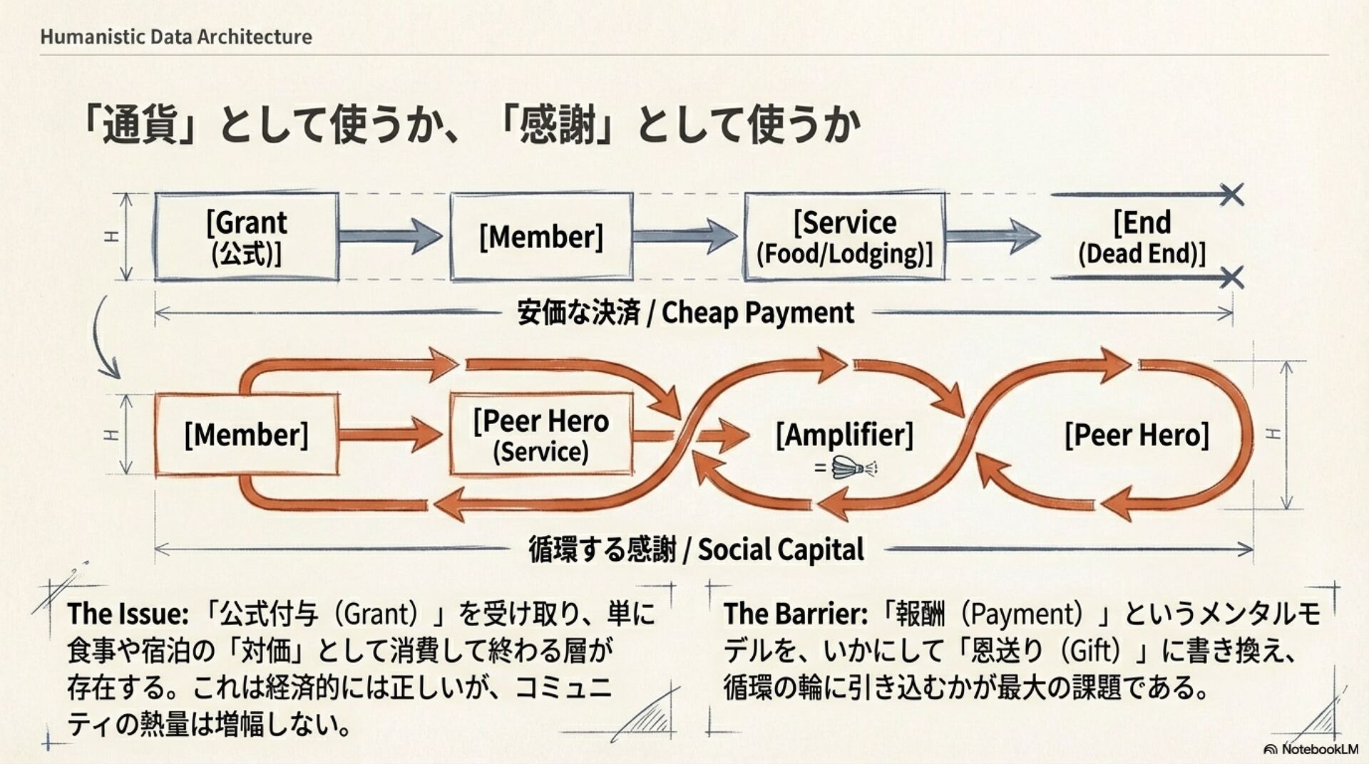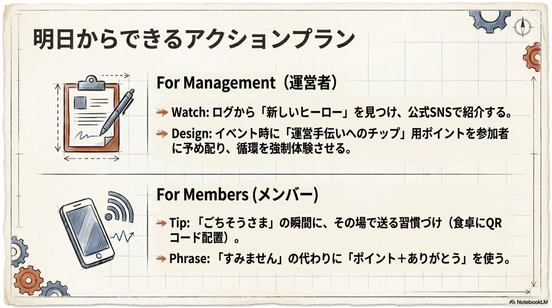 コミュニティの持続には、「報酬(Payment)」というメンタルモデルを「恩送り(Gift)」へ書き換えることが重要です。具体的なアクションとして、増幅者が疲弊しないための支援(ボーナス付与)、感謝される行動のメニュー化(クエストリスト化)、感謝の解像度を上げるためのタグ活用などが提案されています。