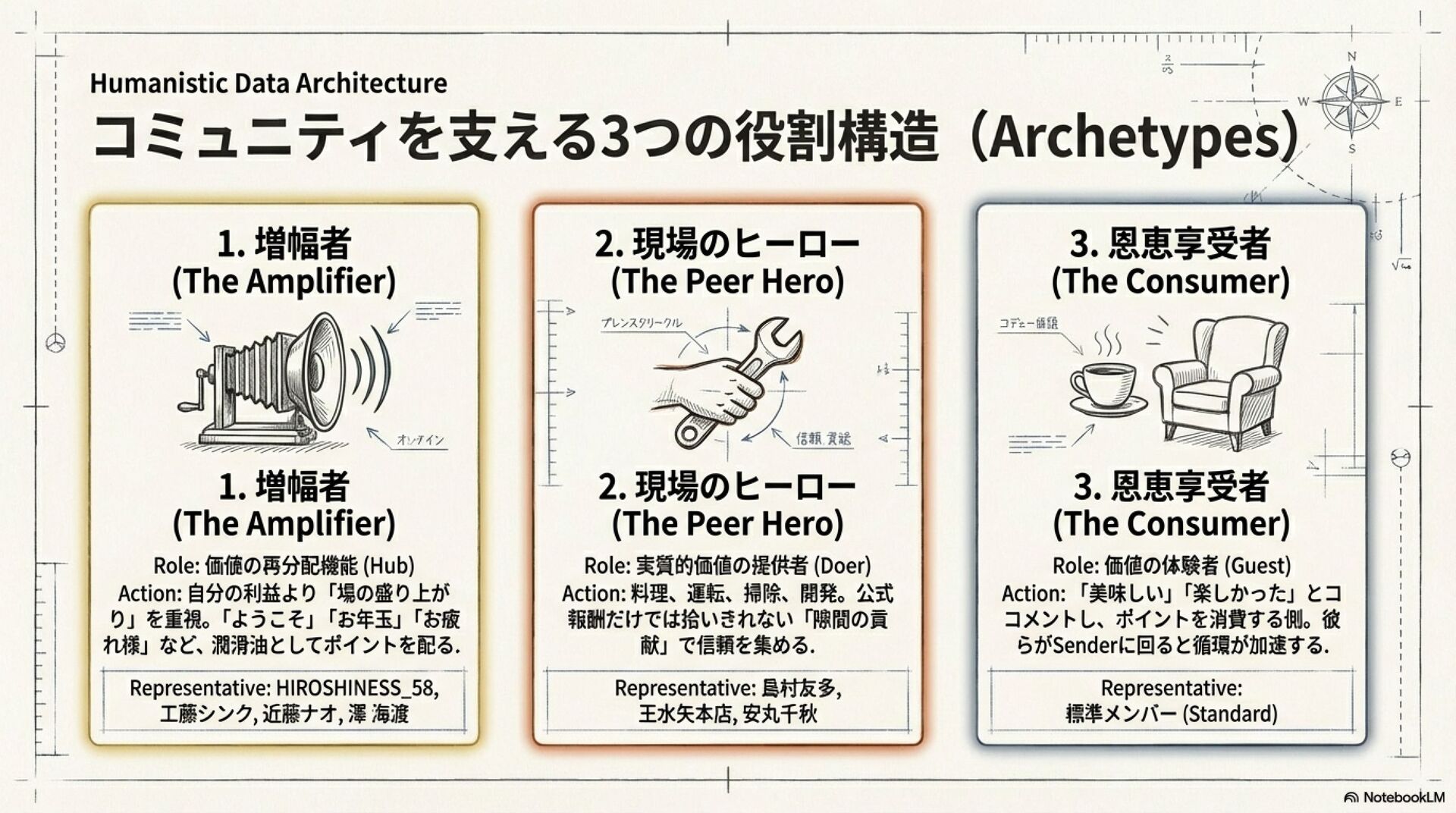 ・Amplifier (増幅者/ふいご):自分の利益より場の盛り上がりを重視し、ポイントを再分配して循環を促す役割。