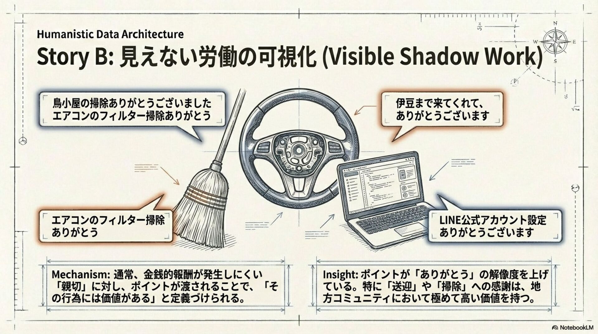 ・Shadow Work Visibility:通常は金銭的報酬が発生しにくい「掃除」や「親切」に対しポイントが送られ、見えない貢献が価値化されています。