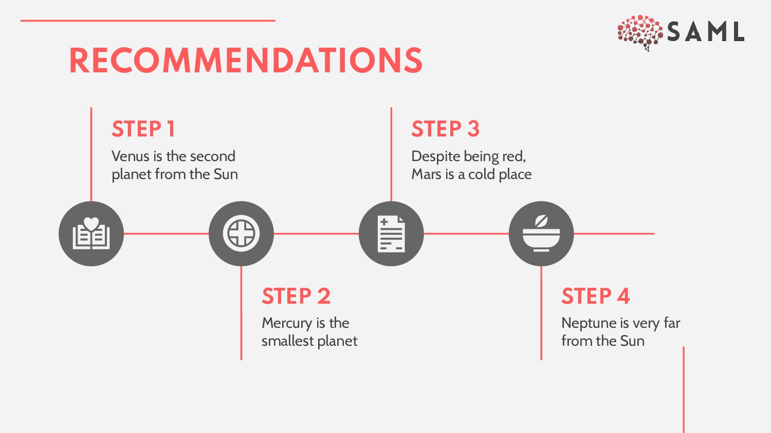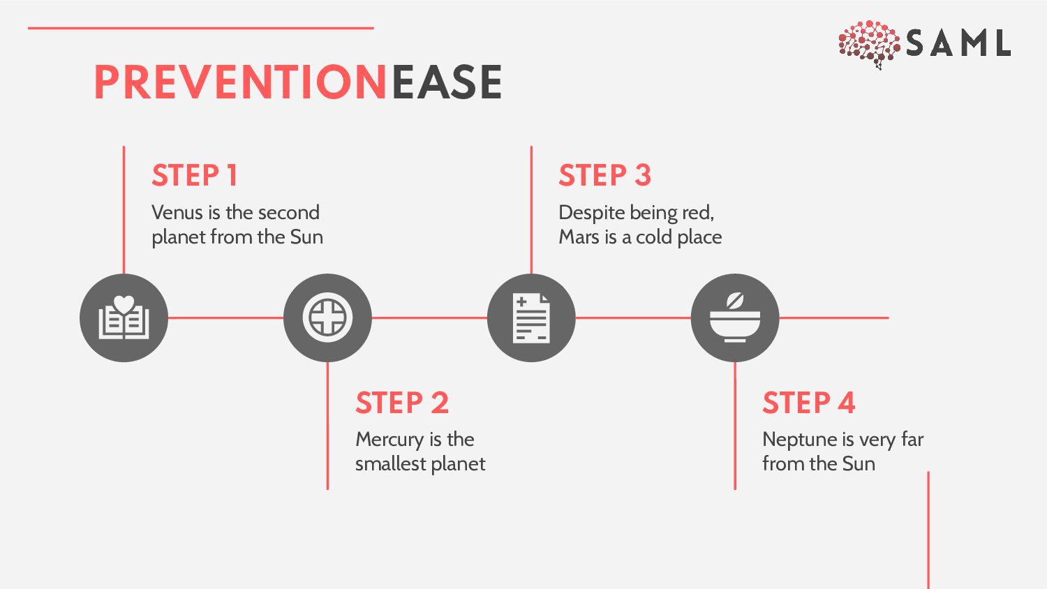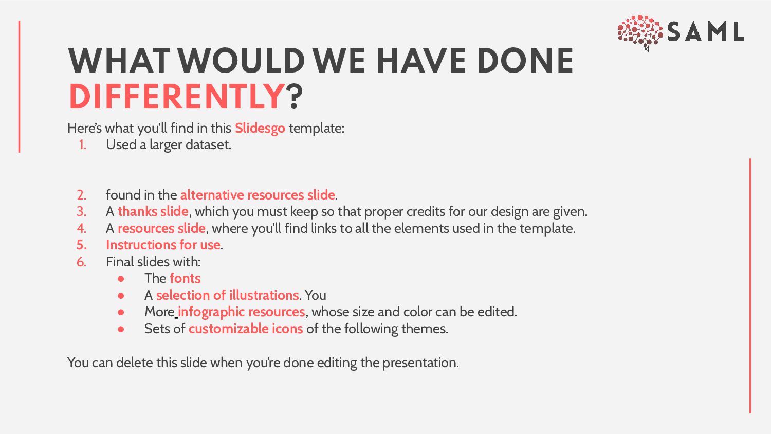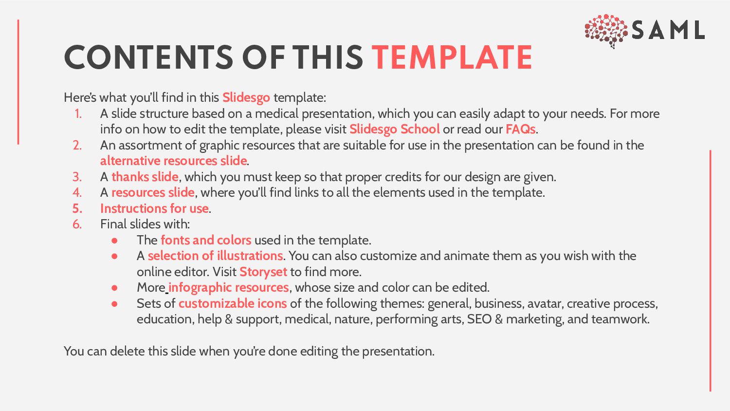 slide structure based on a medical presentation, which you can easily adapt to your needs. For more info on how to edit the template, please visit Slidesgo School or read our FAQs. 2. An assortment of graphic resources that are suitable for use in the presentation can be found in the alternative resources slide. 3. A thanks slide, which you must keep so that proper credits for our design are given. 4. A resources slide, where you’ll find links to all the elements used in the template. 5. Instructions for use. 6. Final slides with: • The fonts and colors used in the template. • A selection of illustrations. You can also customize and animate them as you wish with the online editor. Visit Storyset to find more. • More infographic resources, whose size and color can be edited. • Sets of customizable icons of the following themes: general, business, avatar, creative process, education, help & support, medical, nature, performing arts, SEO & marketing, and teamwork. You can delete this slide when you’re done editing the presentation. CONTENTS OF THIS TEMPLATE
